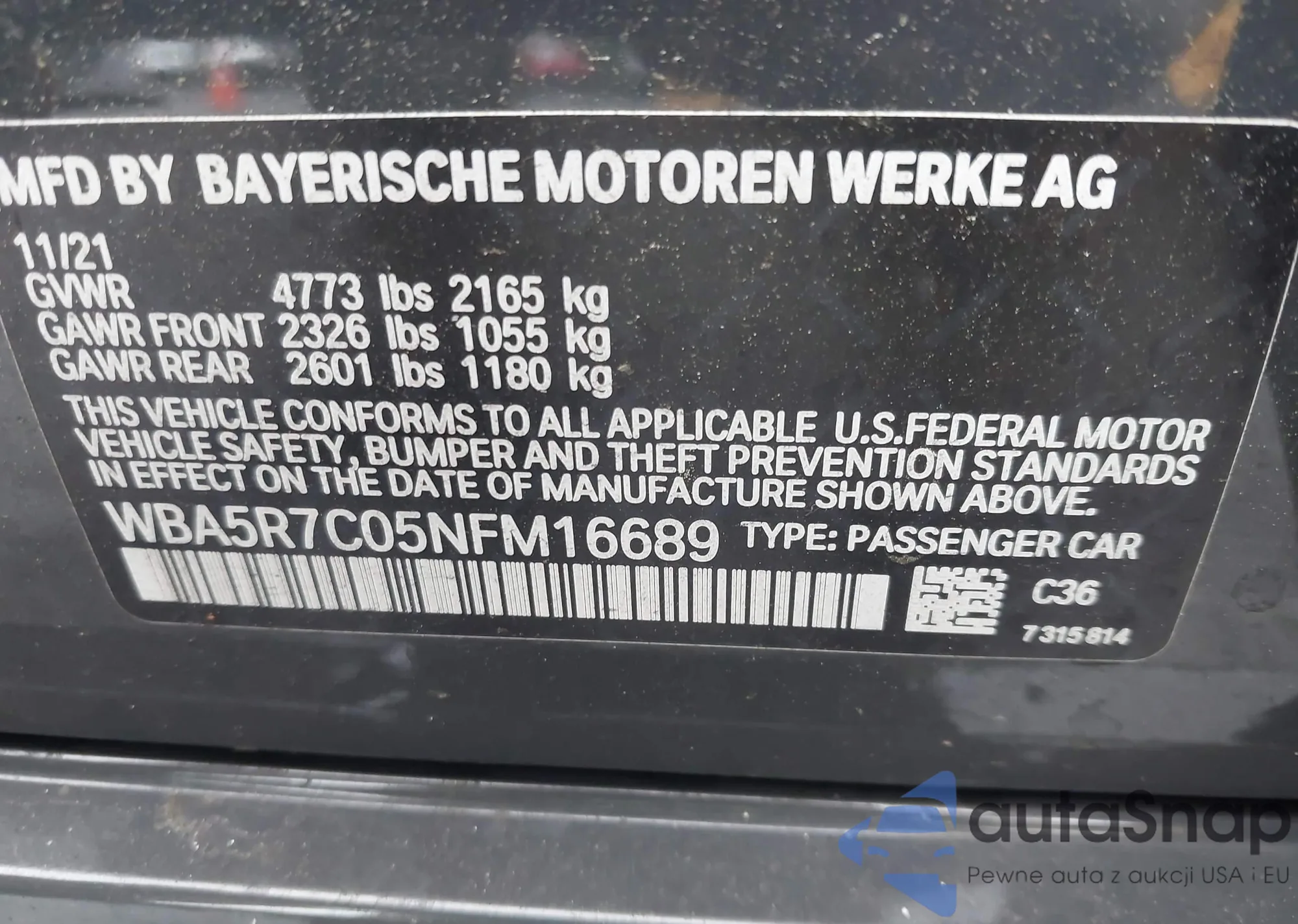 • VIN WBA5R7C05NFM16689