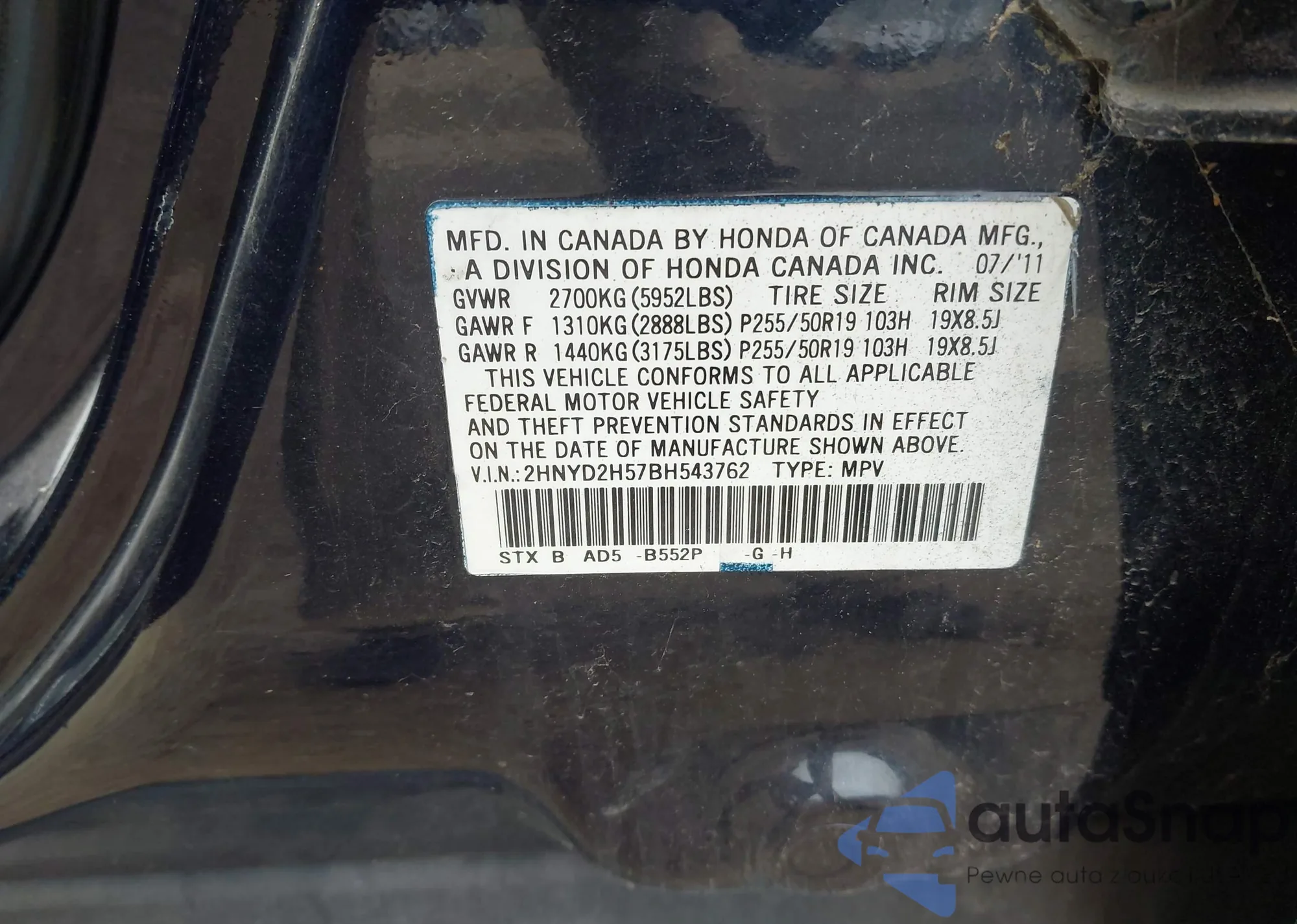 • VIN 2HNYD2H57BH543762