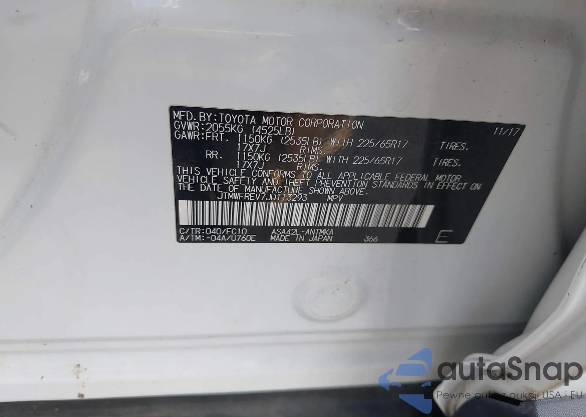 LOT: 42515929 VIN: JTMWFREV7JD113293