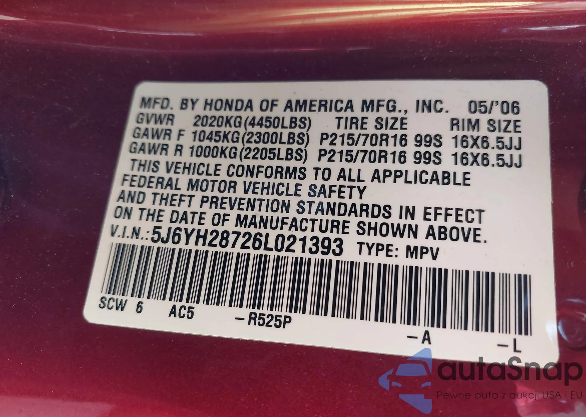 • VIN 5J6YH28726L021393