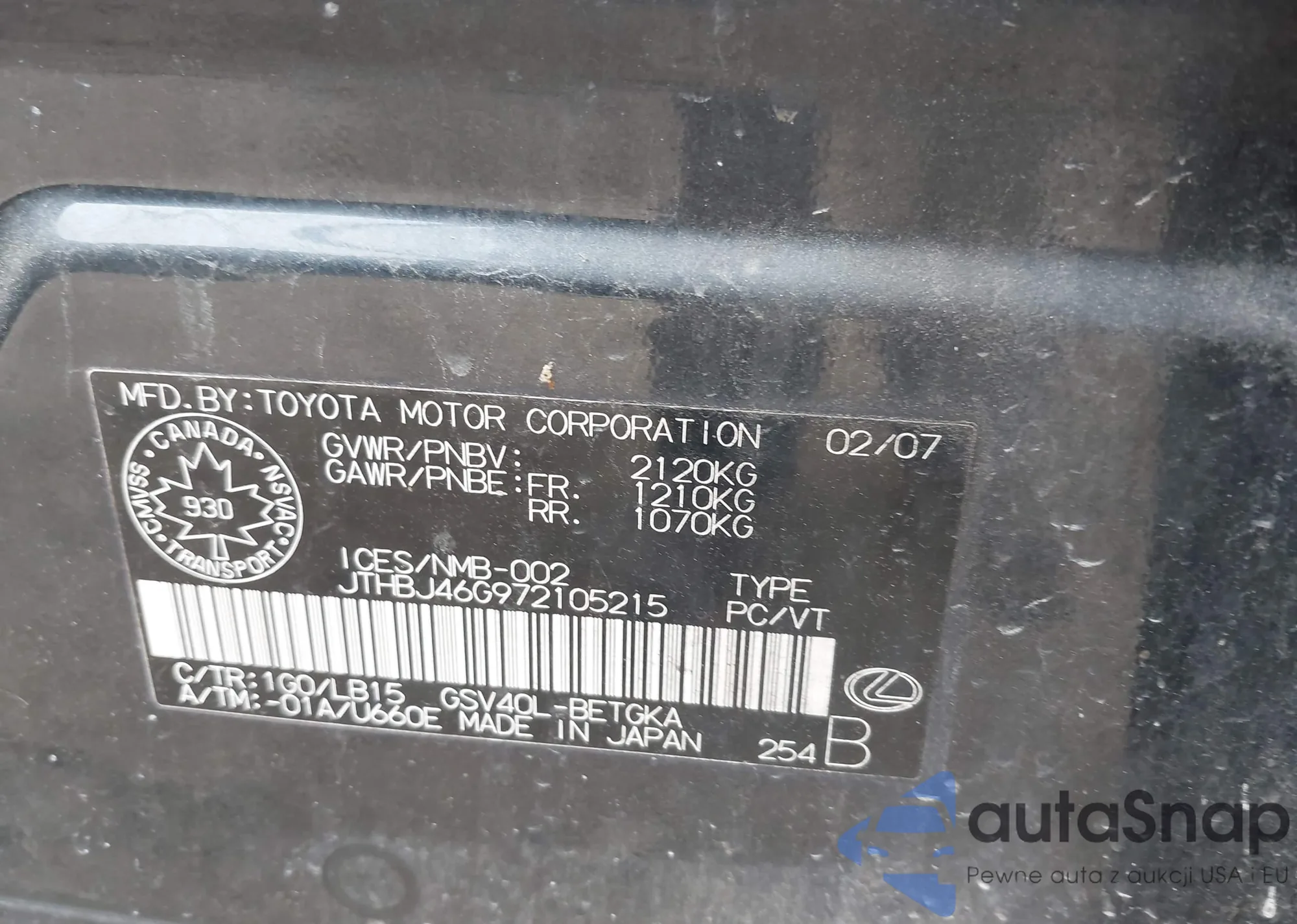 LOT: 42631979 VIN: JTHBJ46G972105215
