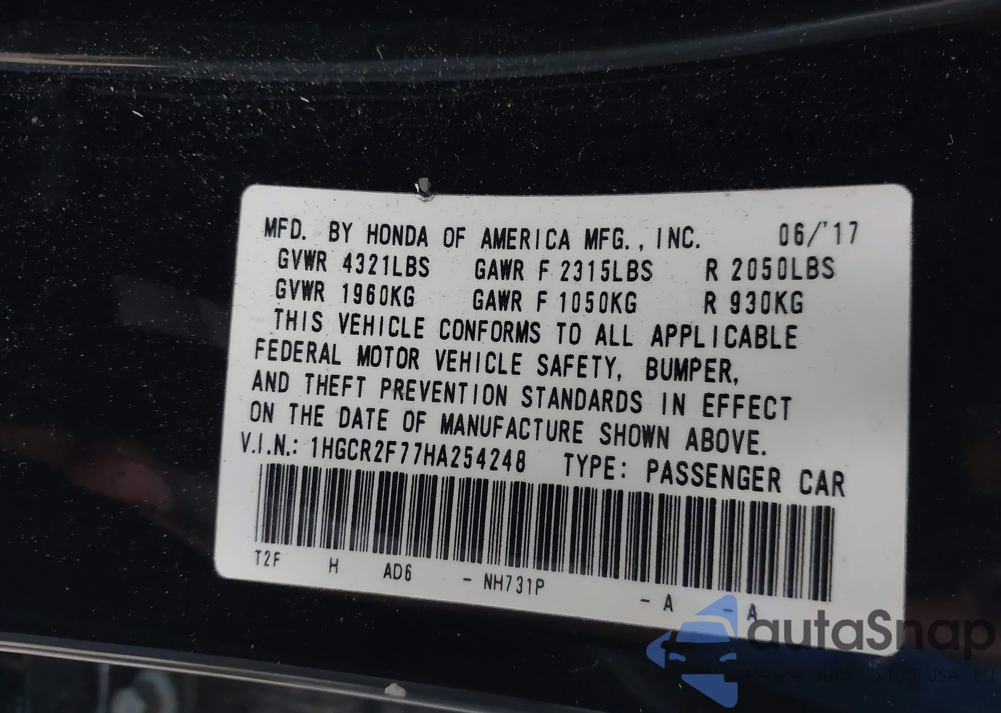 • VIN 1HGCR2F77HA254248
