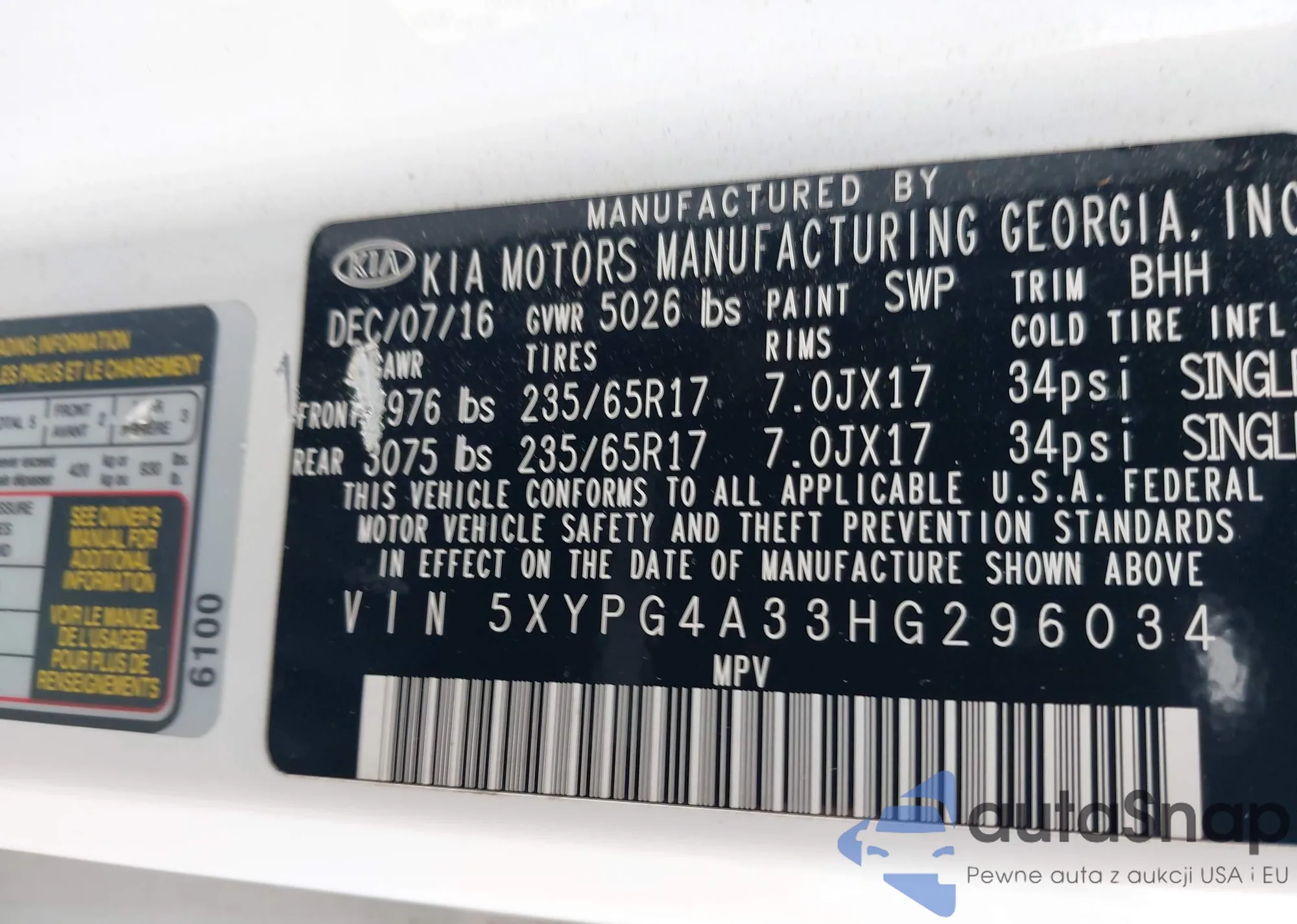 • VIN 5XYPG4A33HG296034