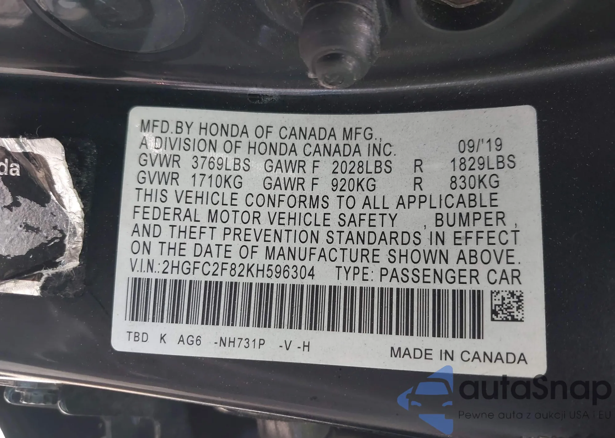• VIN 2HGFC2F82KH596304