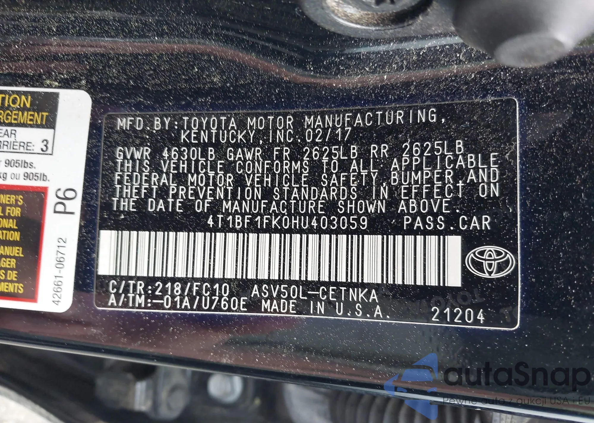 • VIN 4T1BF1FK0HU403059