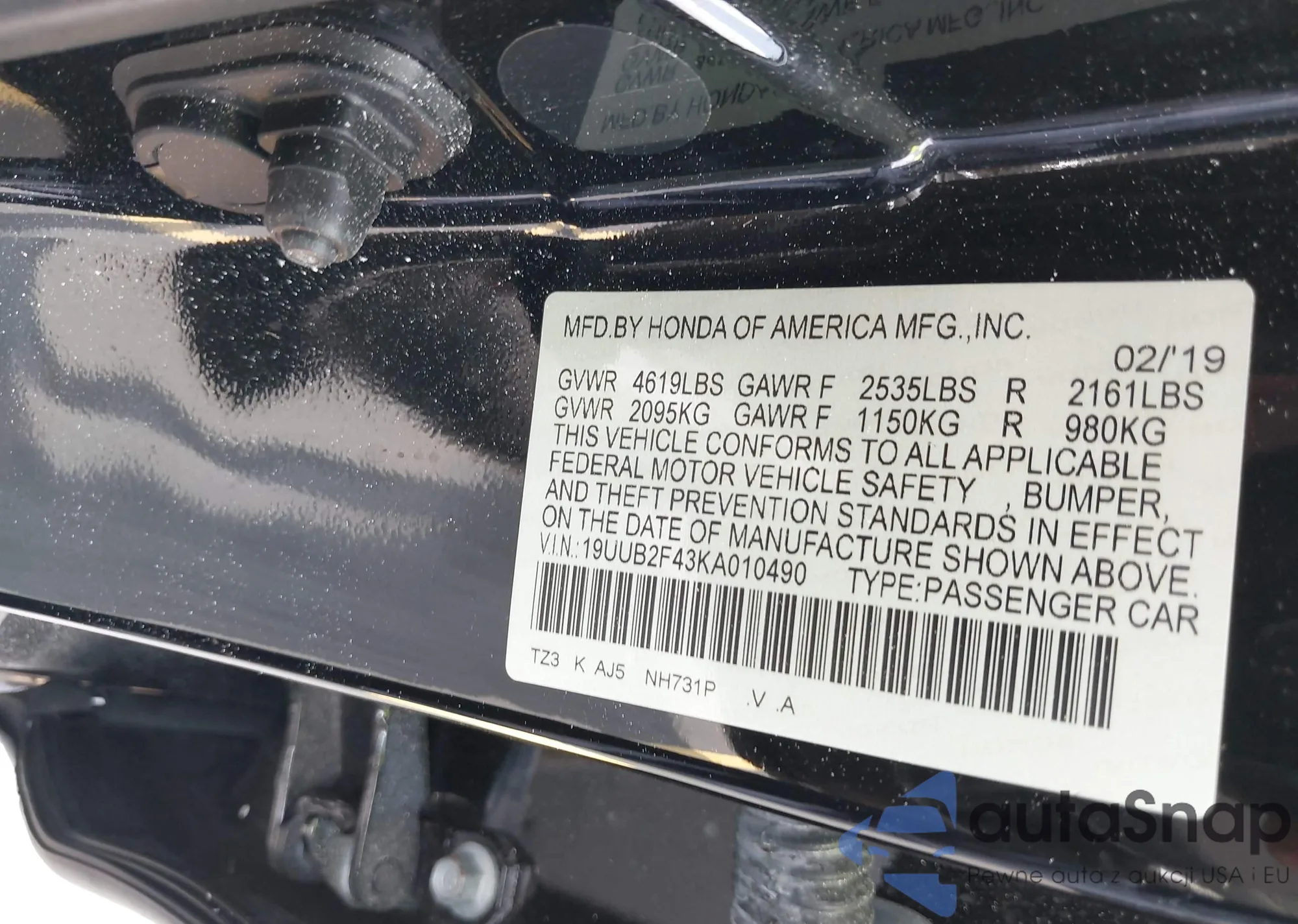 • VIN 19UUB2F43KA010490