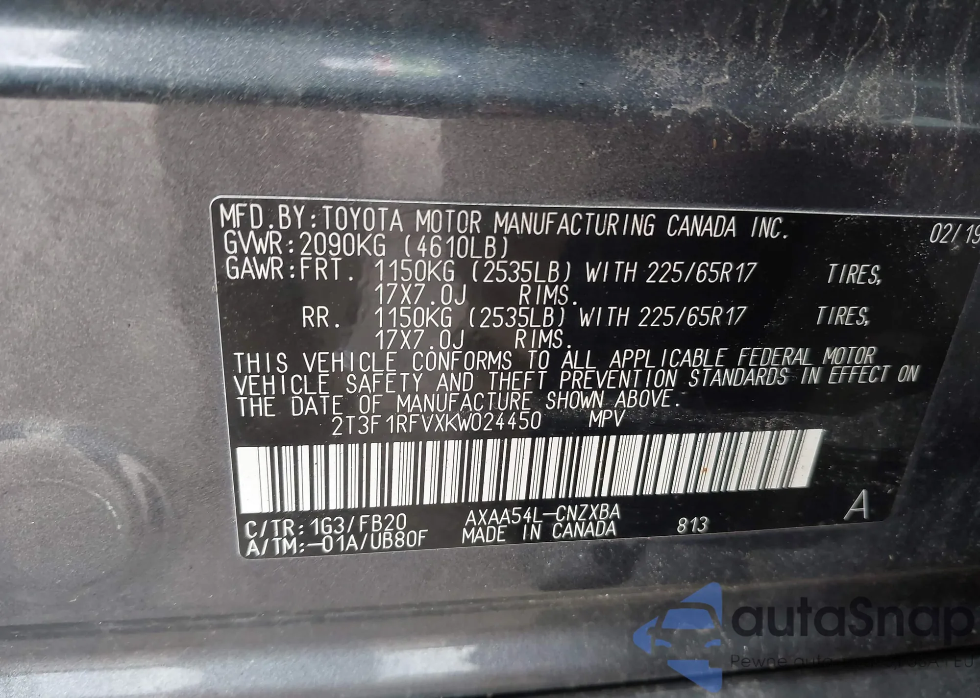 • VIN 2T3F1RFVXKW024450