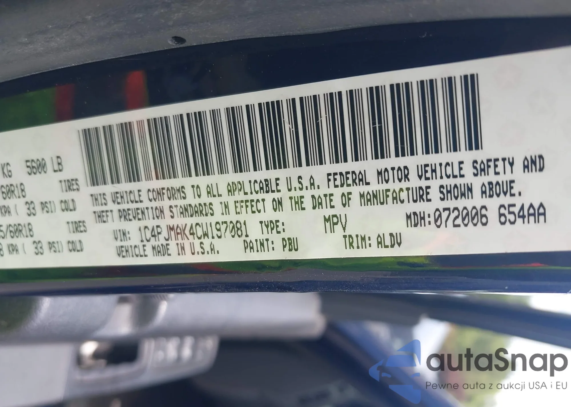 LOT: 42511559 VIN: 1C4PJMAK4CW197081