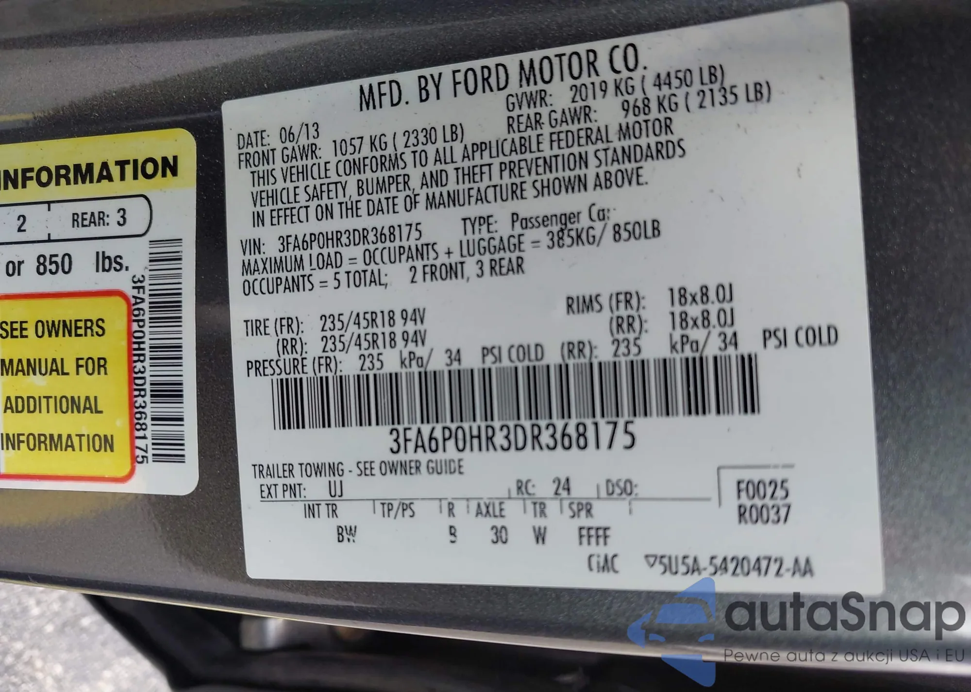 LOT: 42558443 VIN: 3FA6P0HR3DR368175