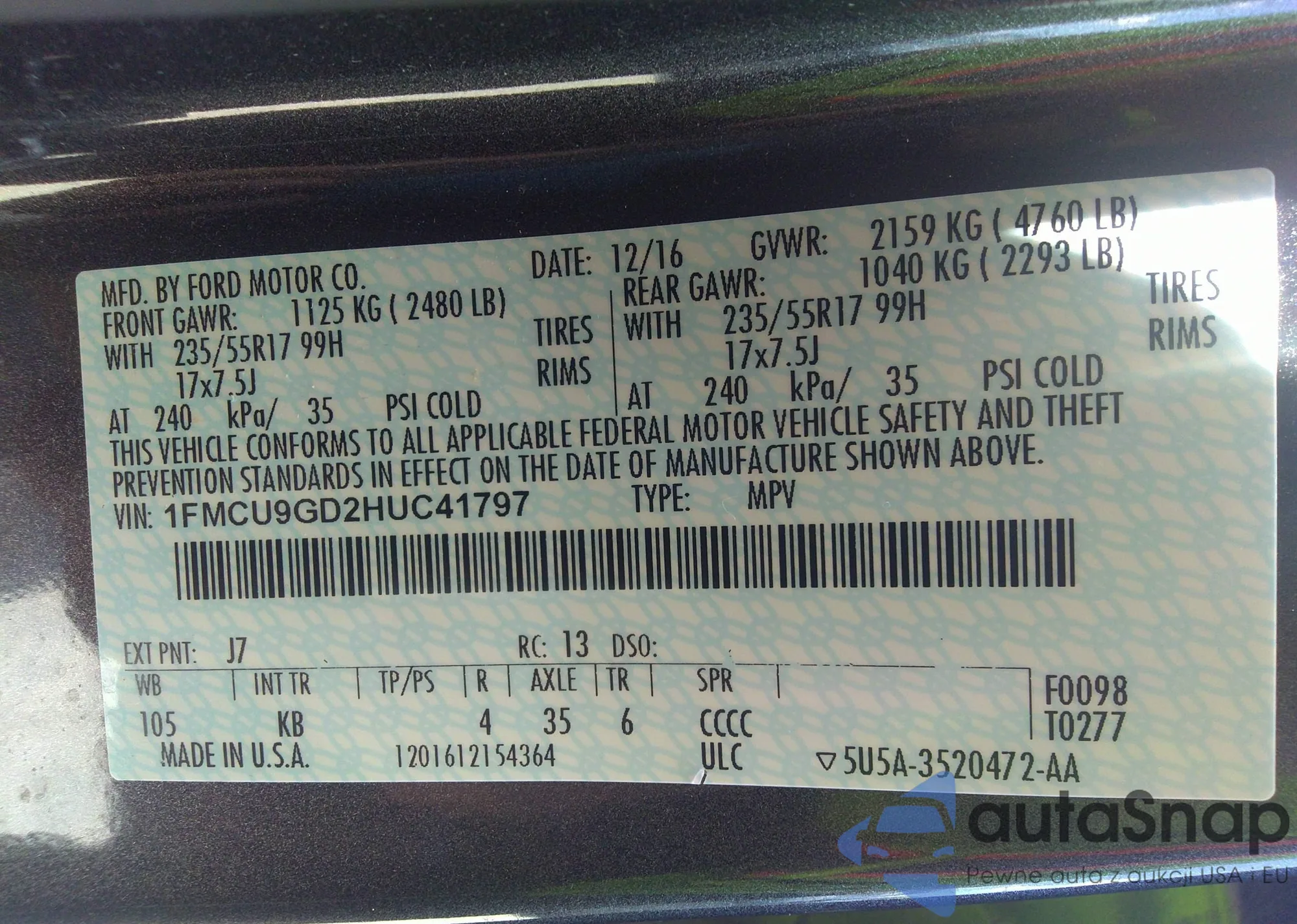 • VIN 1FMCU9GD2HUC41797