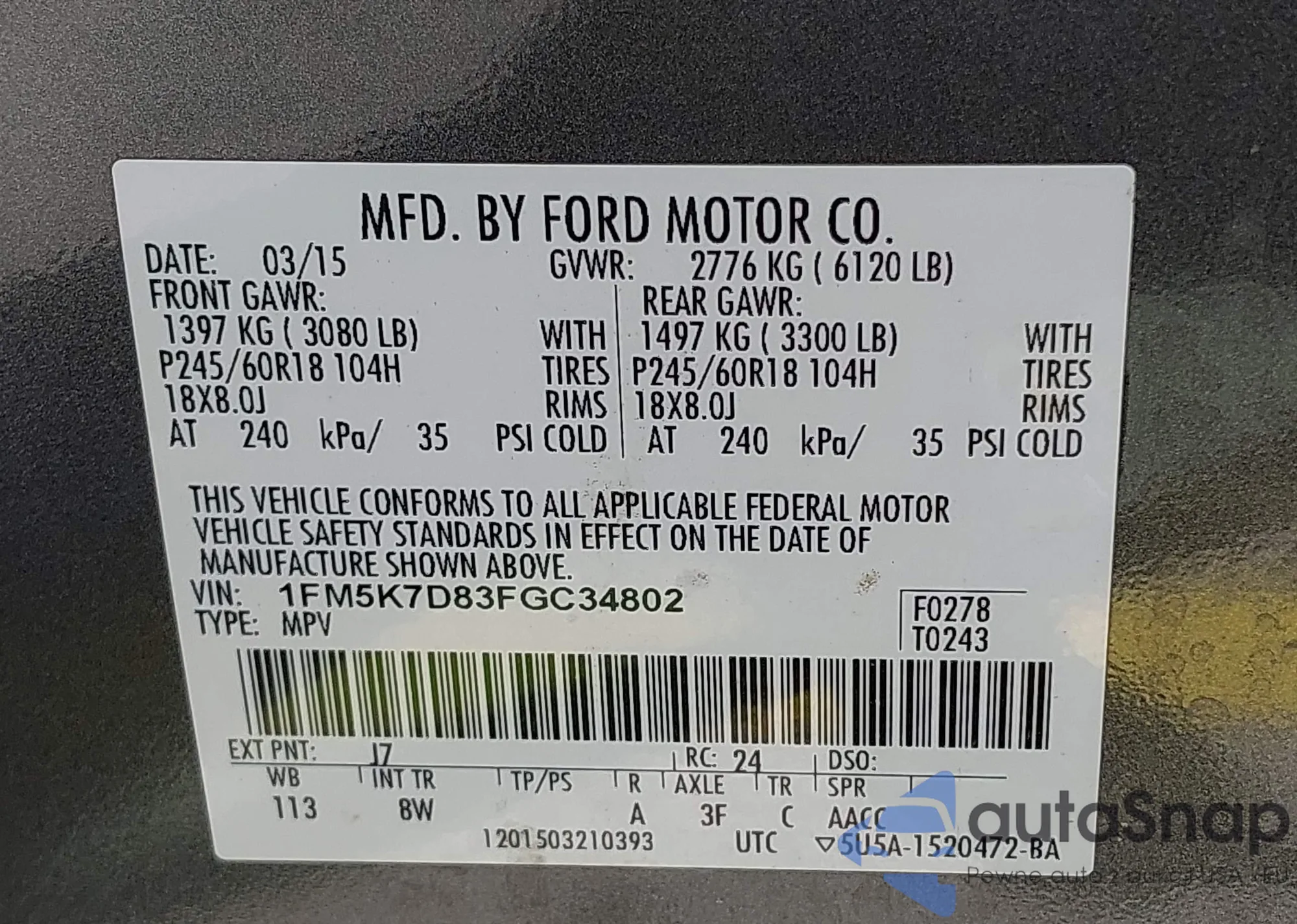LOT: 42377734 VIN: 1FMCU0F77HUC84944