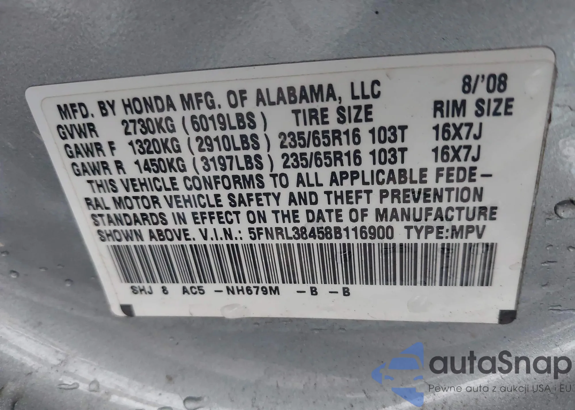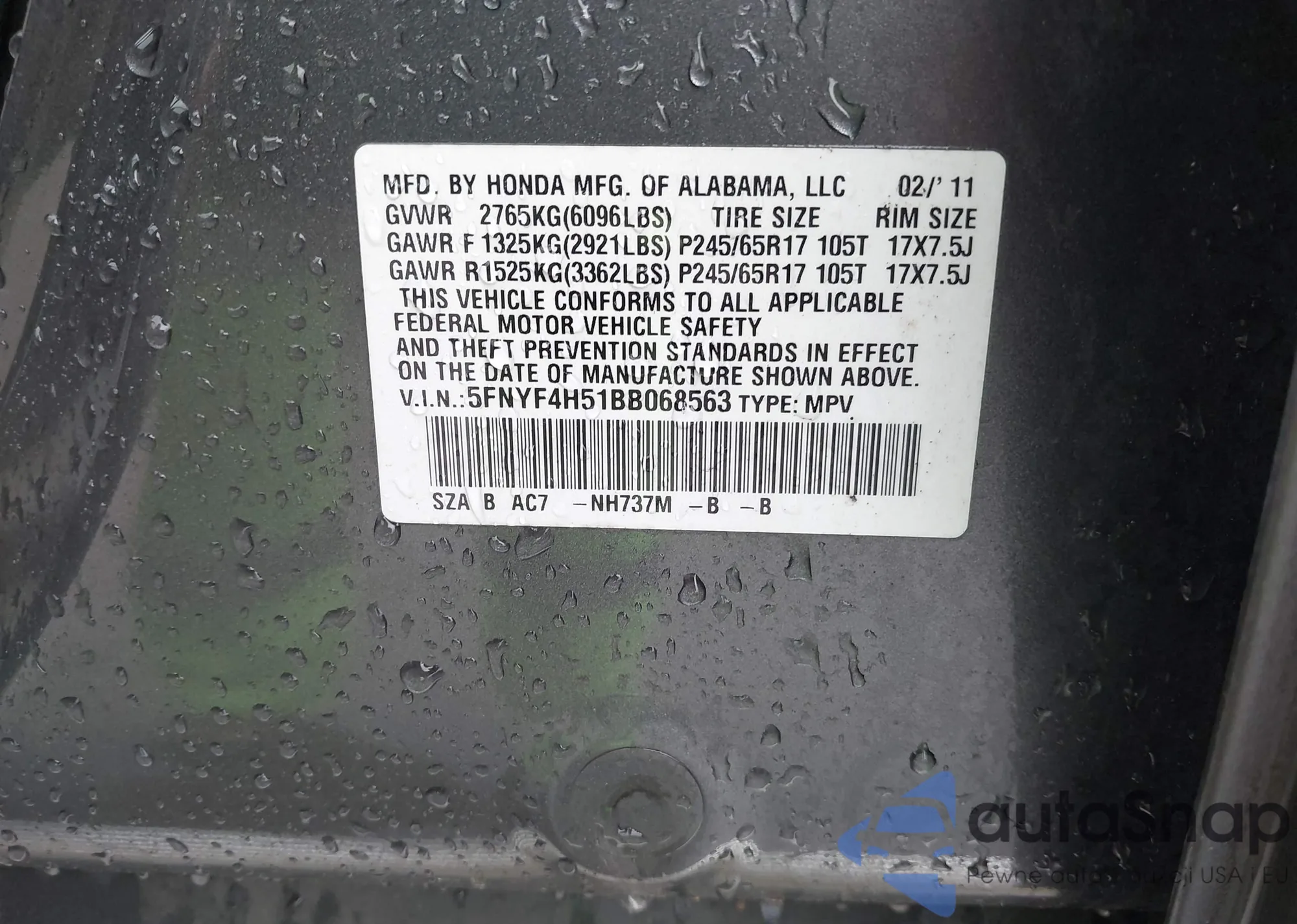 • VIN 5FNYF4H51BB068563