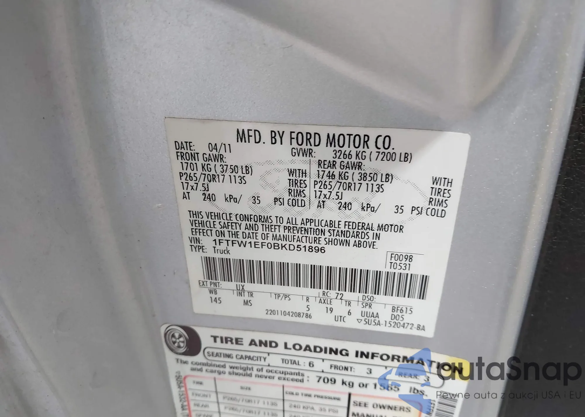 LOT: 42508480 VIN: 1FTFW1EF0BKD51896