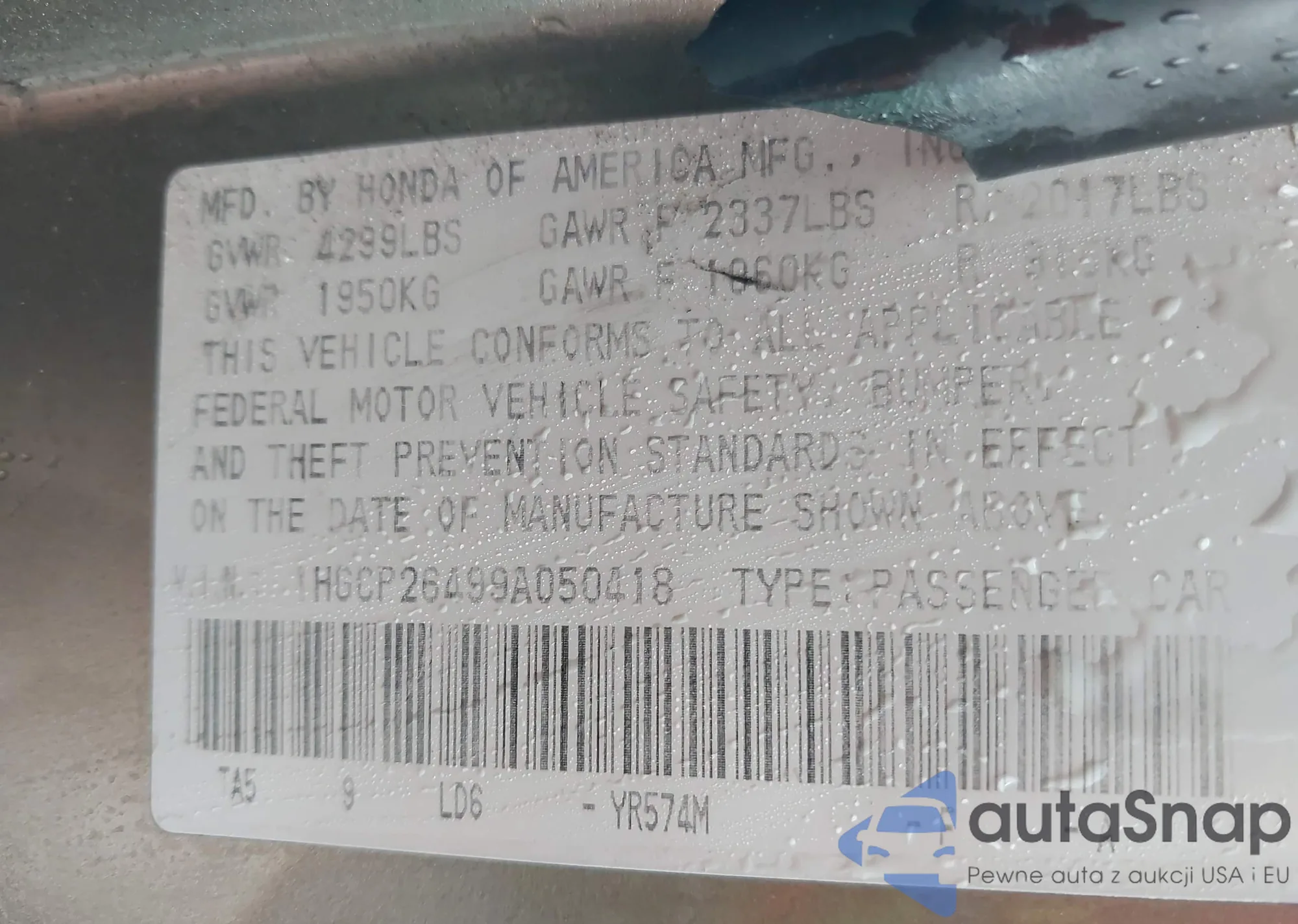 LOT: 42467185 VIN: 1HGCP26499A050418