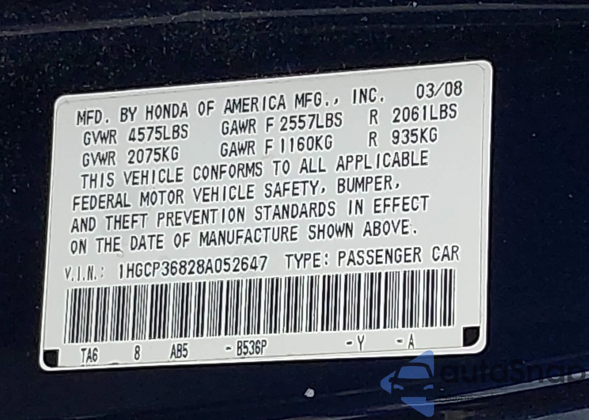 LOT: 42671907 VIN: 1HGCP36828A052647