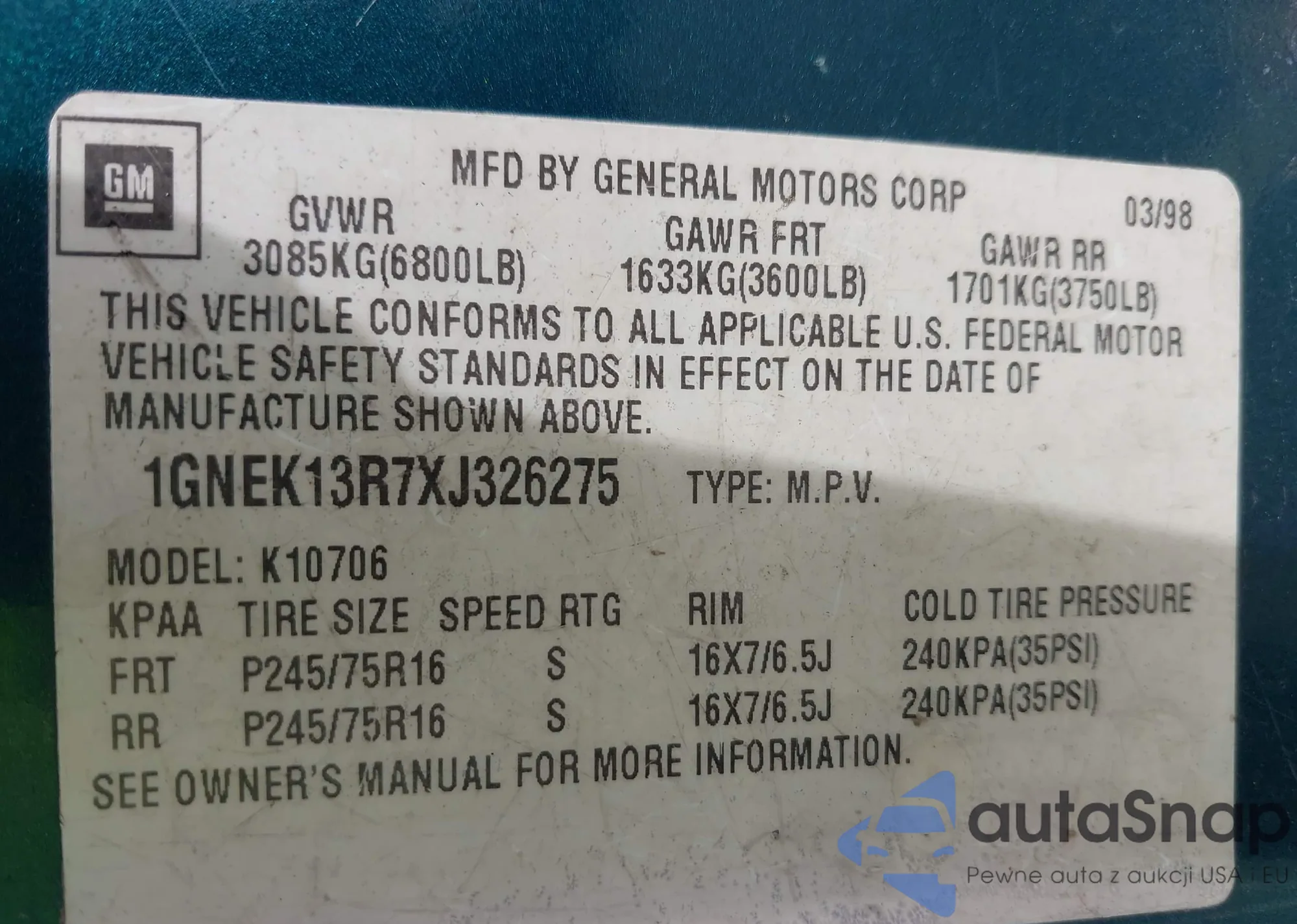 • VIN 1GNEK13R7XJ326275