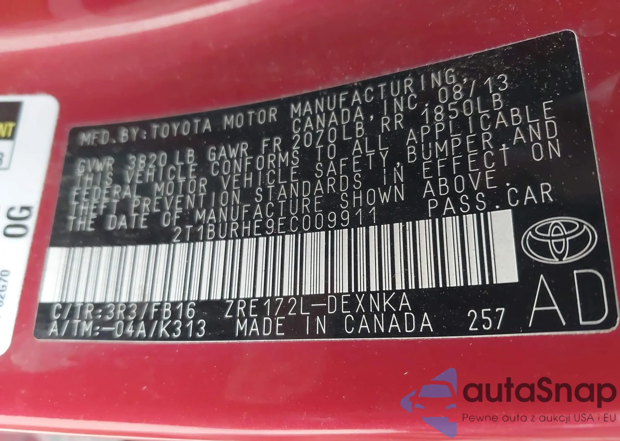 • VIN 4T3BK3BB9DU085974