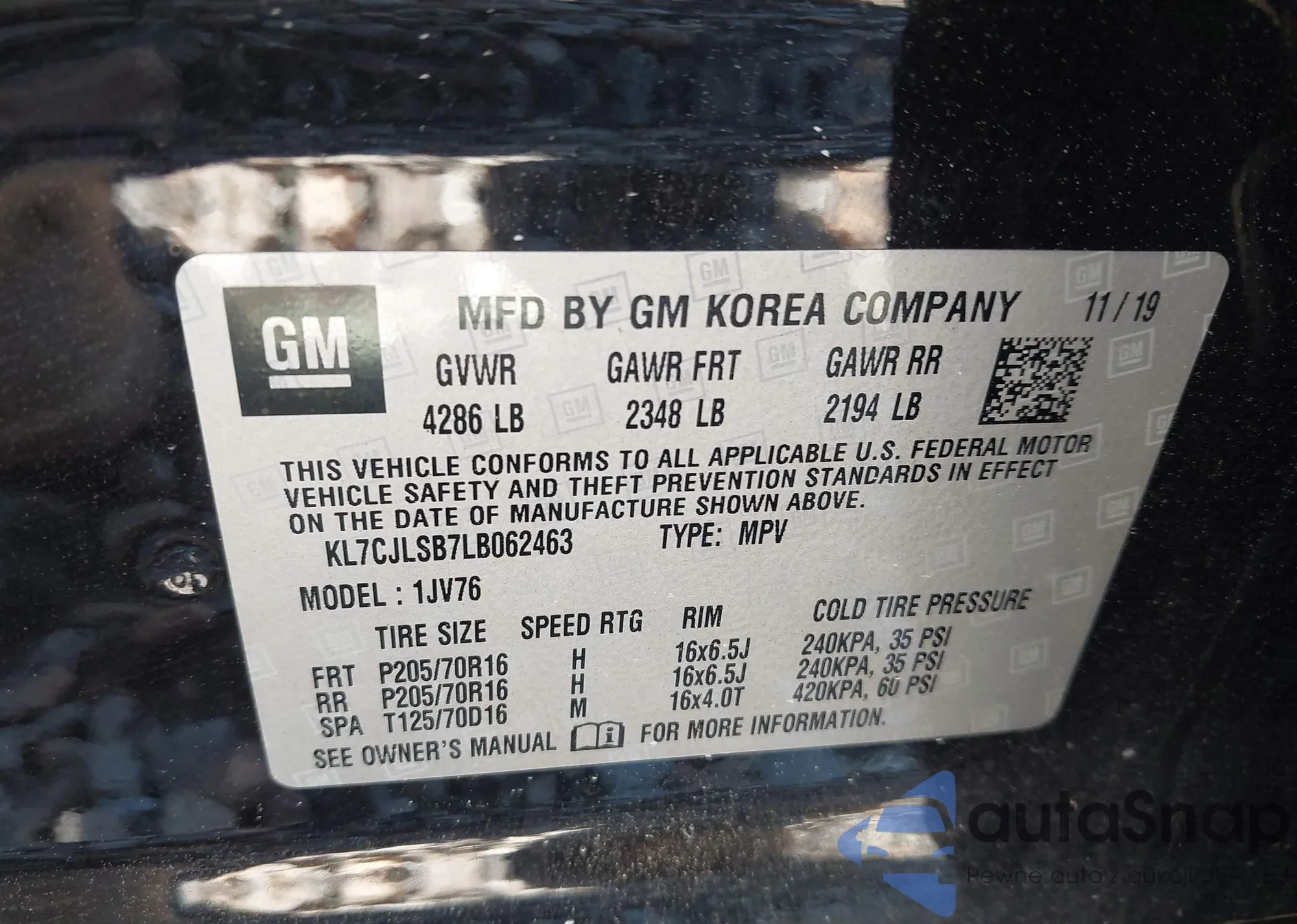 • VIN KL7CJLSB7LB062463