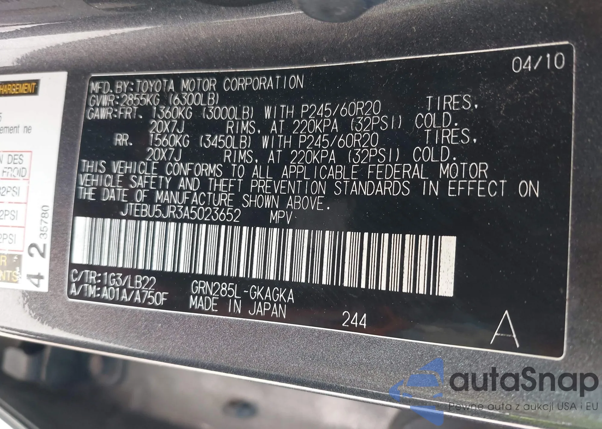 LOT: 42589296 VIN: JTEBU5JR3A5023652