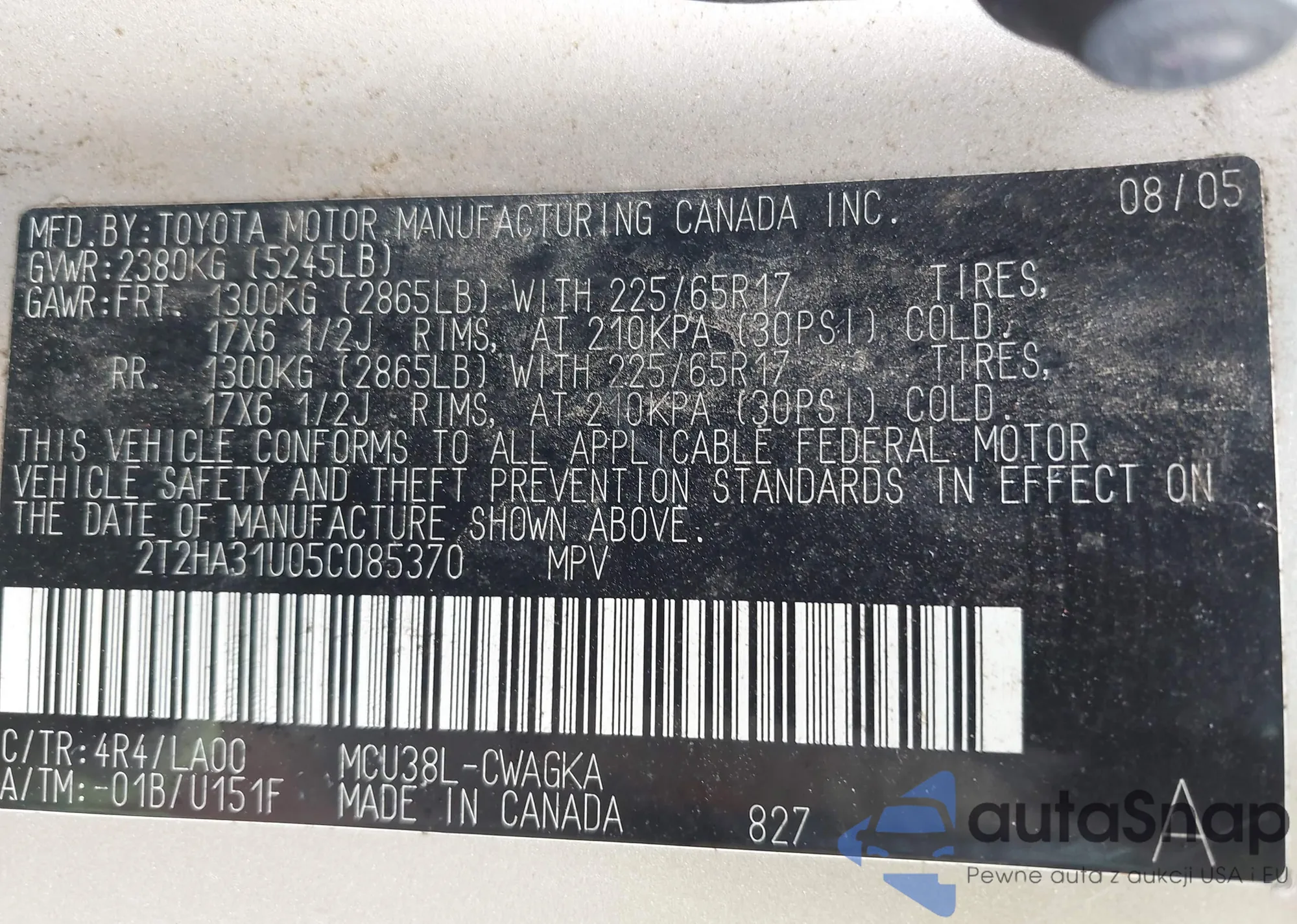 • VIN 2T2HA31U05C085370