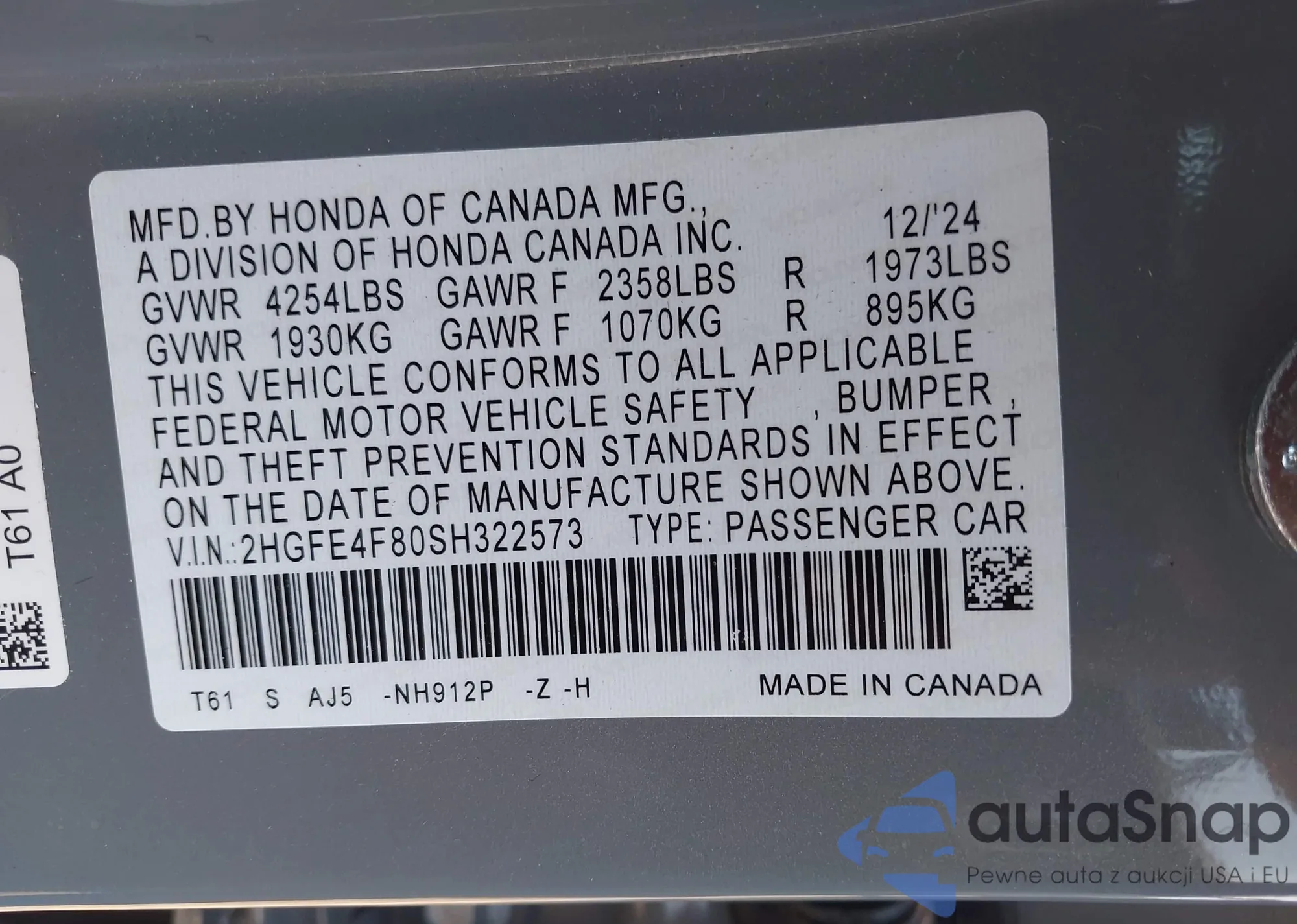 • VIN 2HGFE4F80SH322573