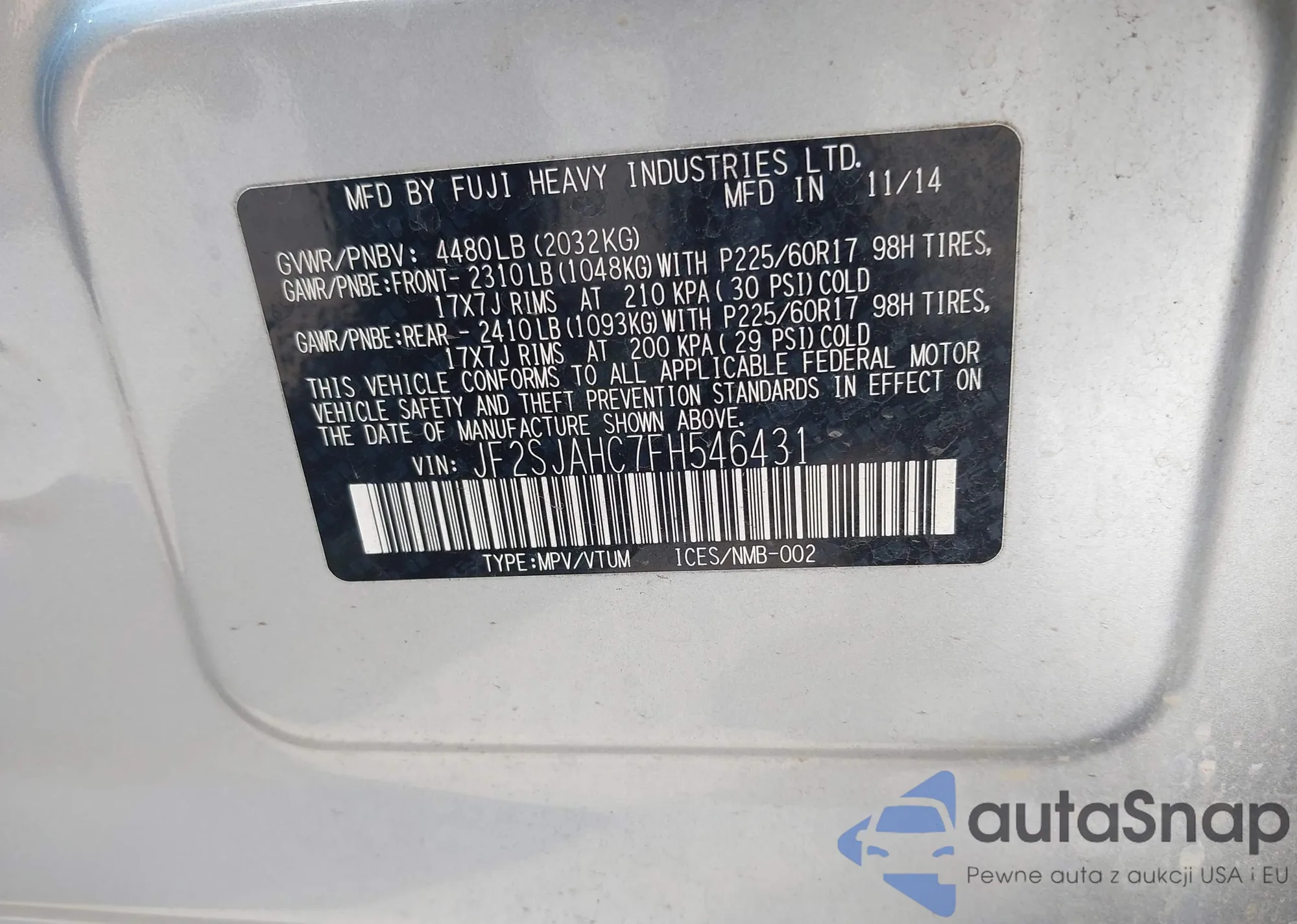 • VIN JF2SJAHC7FH546431