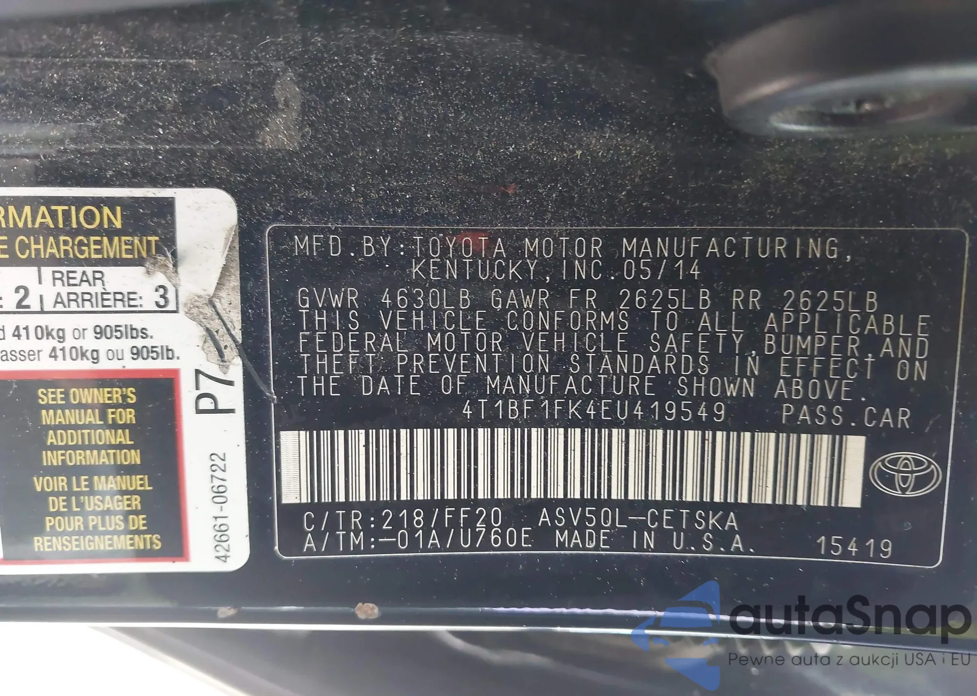 • VIN 4T1BF1FK4EU419549
