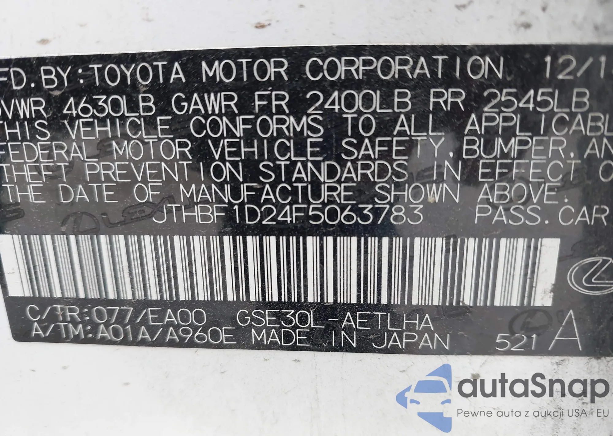 LOT: 42496702 VIN: JTHBF1D24F5063783