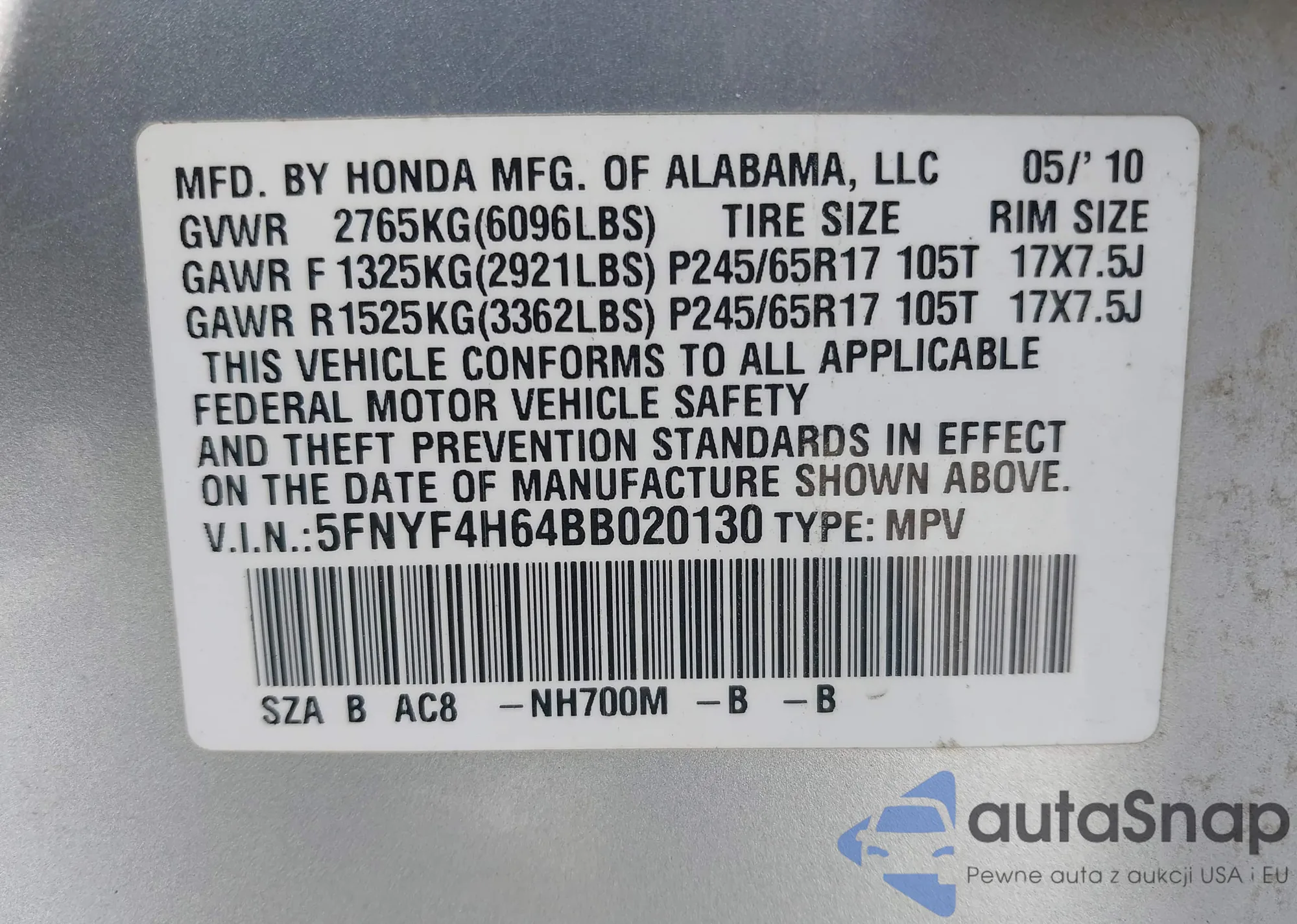 LOT: 42224002 VIN: 5FNYF4H65BB055808