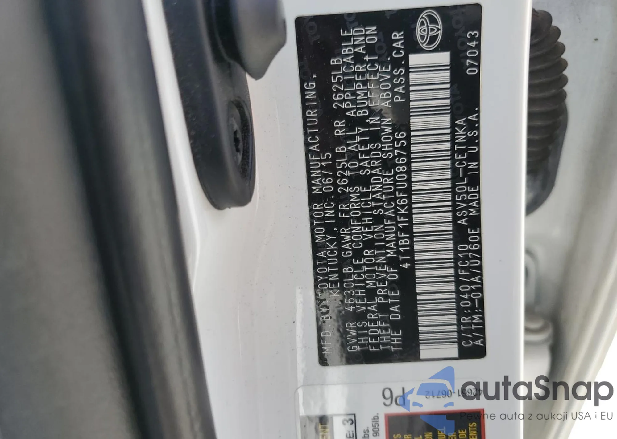 LOT: 61647475 VIN: 4T1BF1FK6FU086756