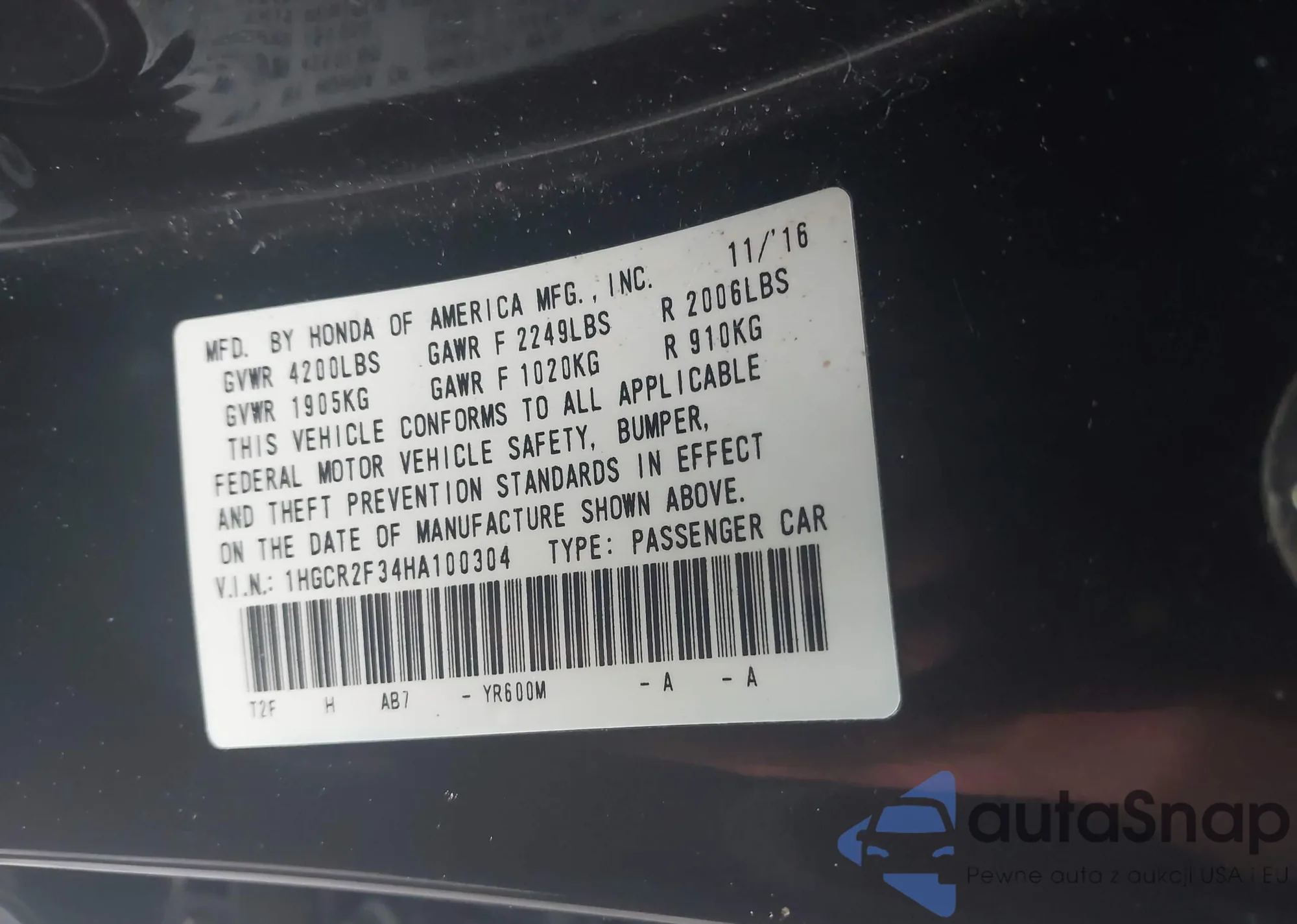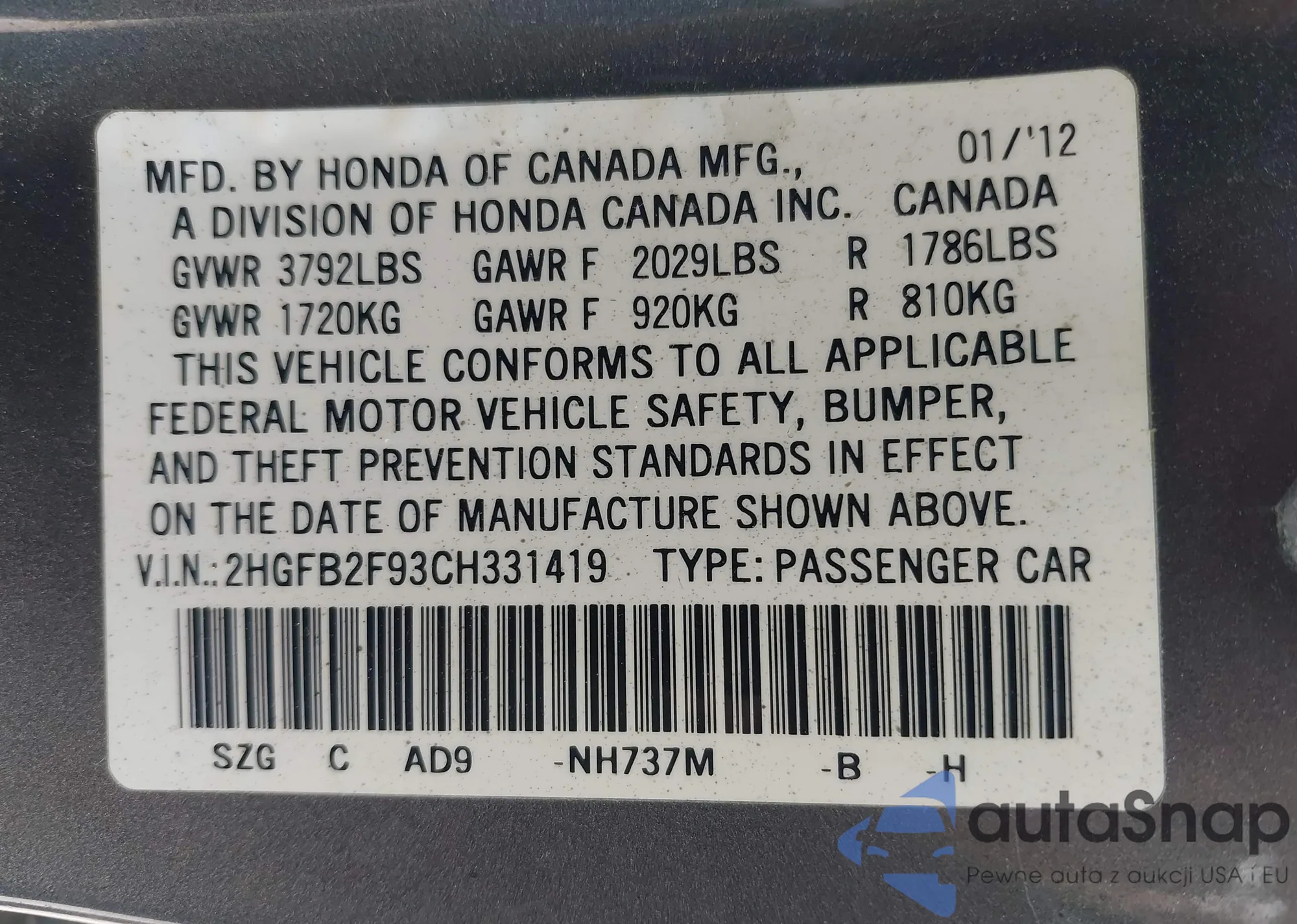 LOT: 42577208 VIN: 2HGFB2F93CH331419