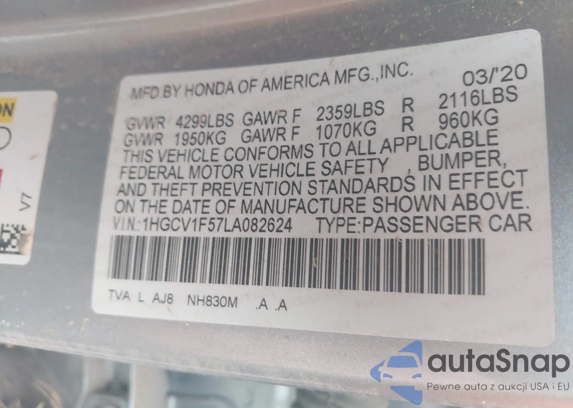 LOT: 42449978 VIN: 1HGCV1F57LA082624