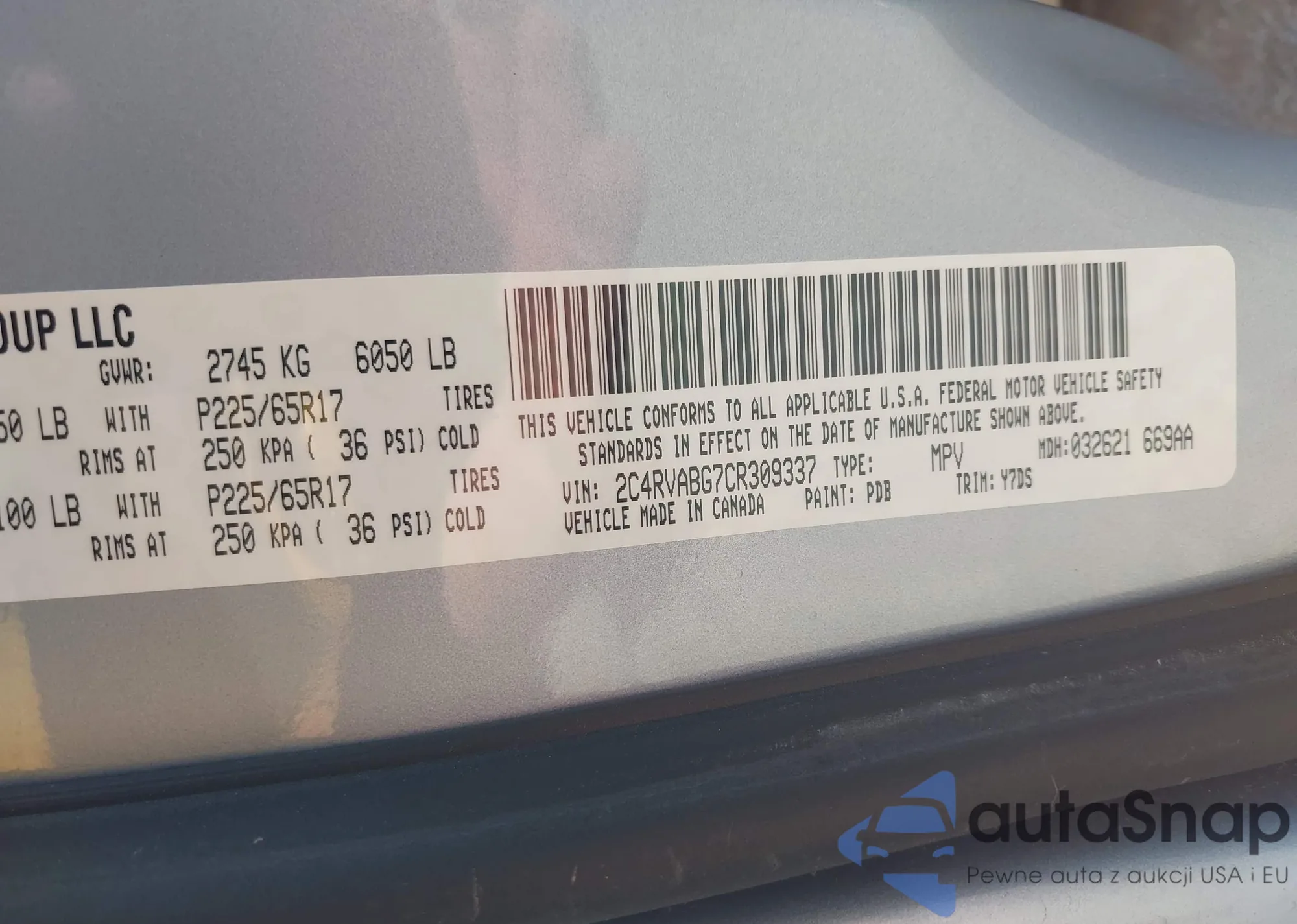 • VIN 2C4RVABG7CR309337