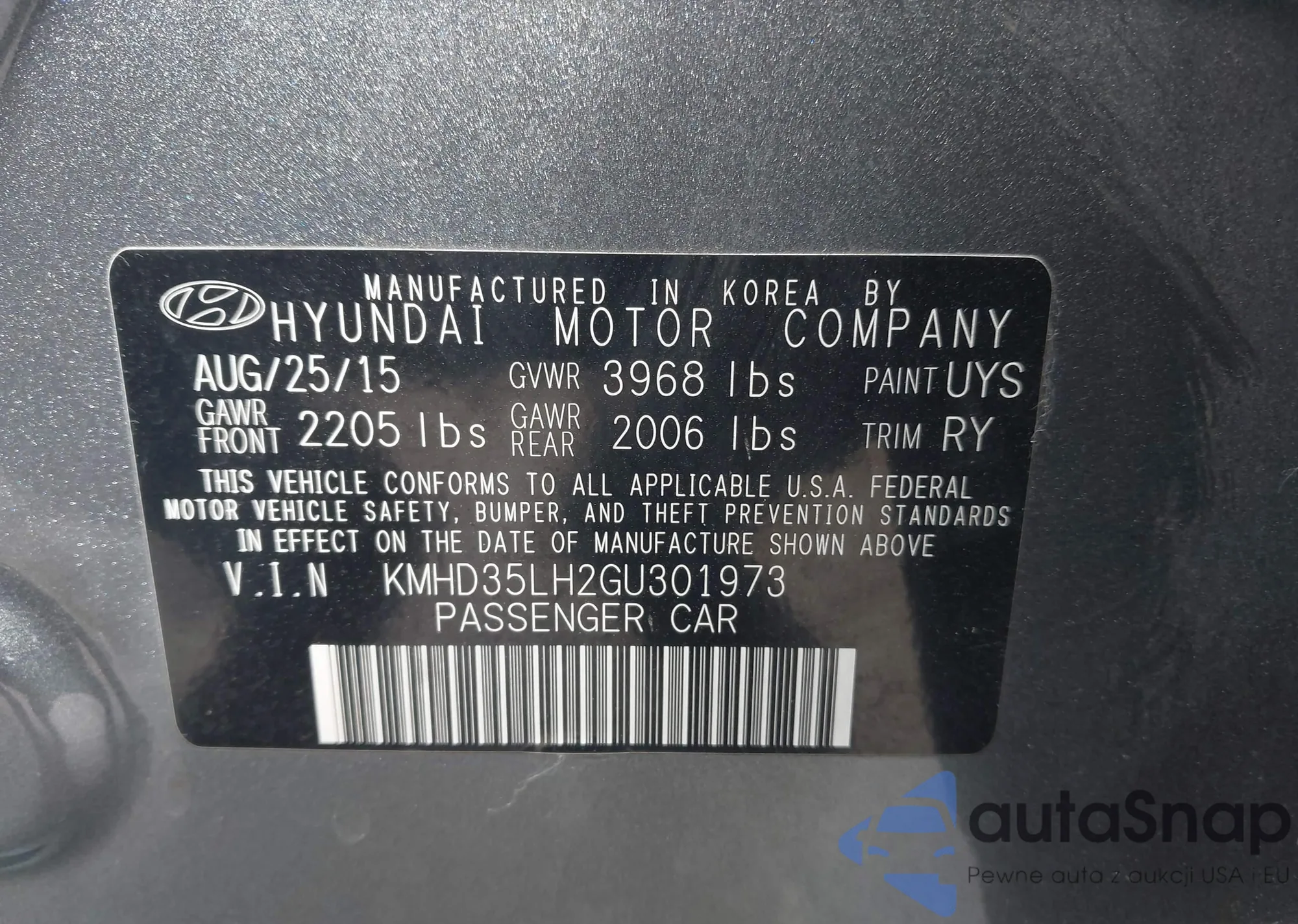LOT: 42177128 VIN: KMHD35LH2GU301973
