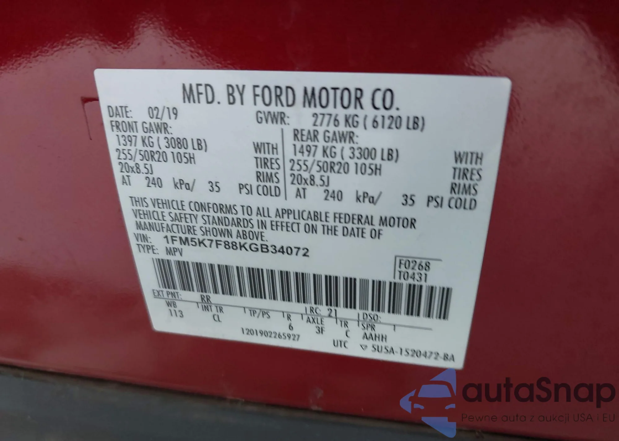 • VIN 1FMHK7F9XCGA94830