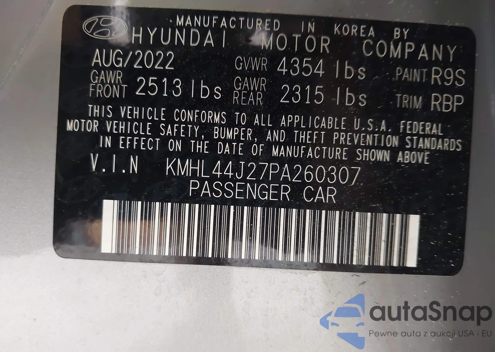 LOT: 42332372 VIN: KMHL44J27PA260307