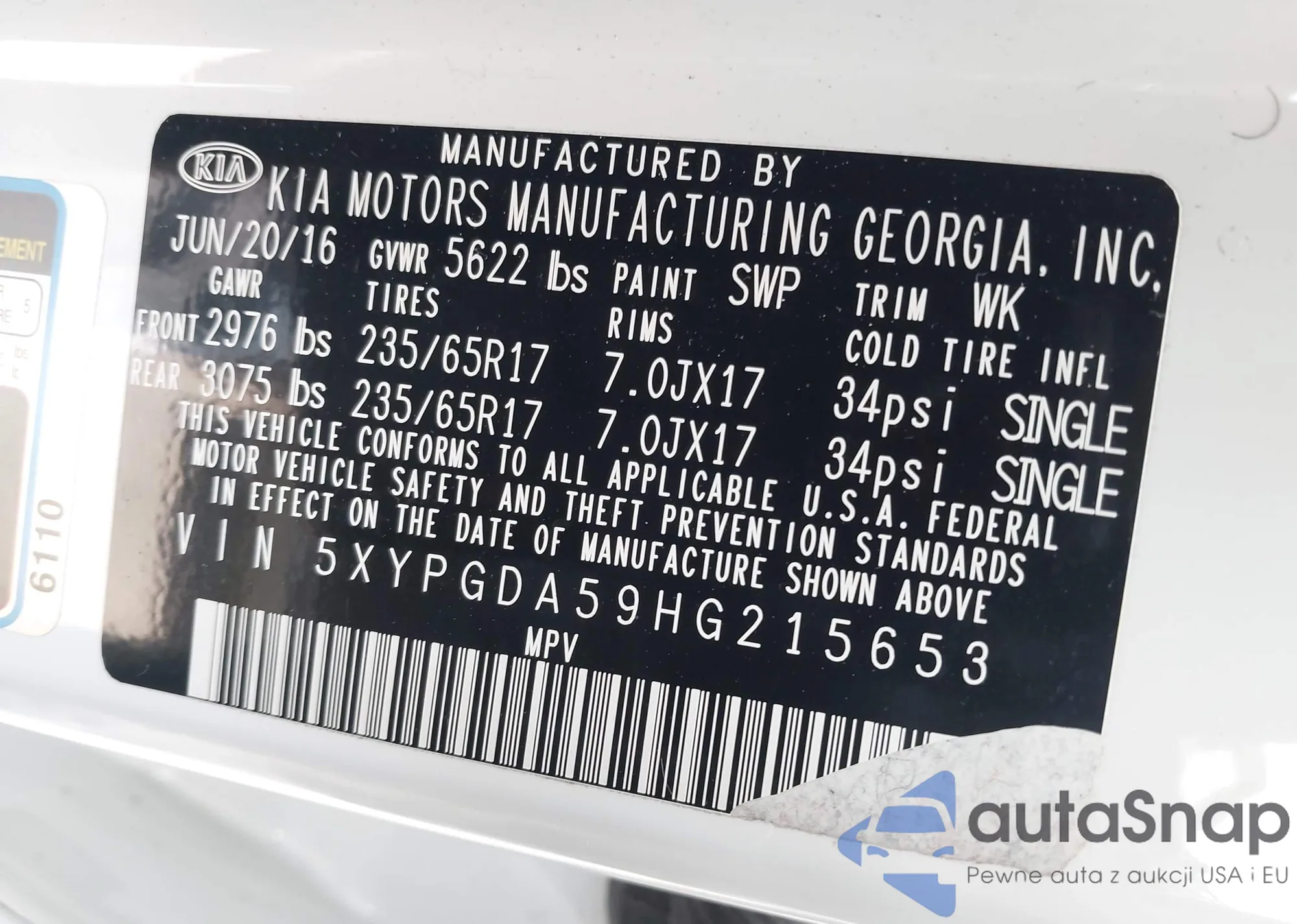 • VIN 5XYPGDA59HG215653