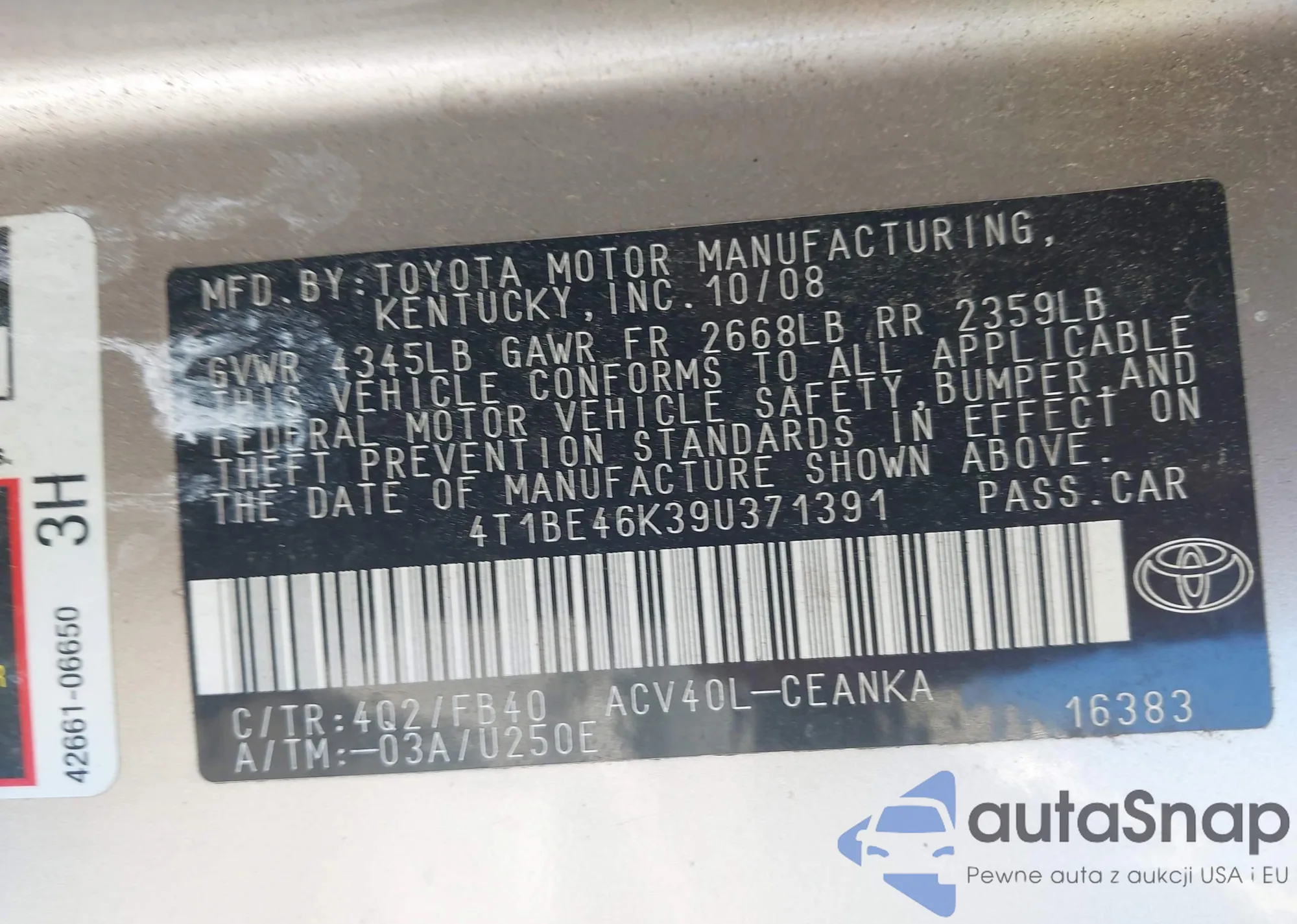LOT: 42580086 VIN: 4T1BE46K39U371391