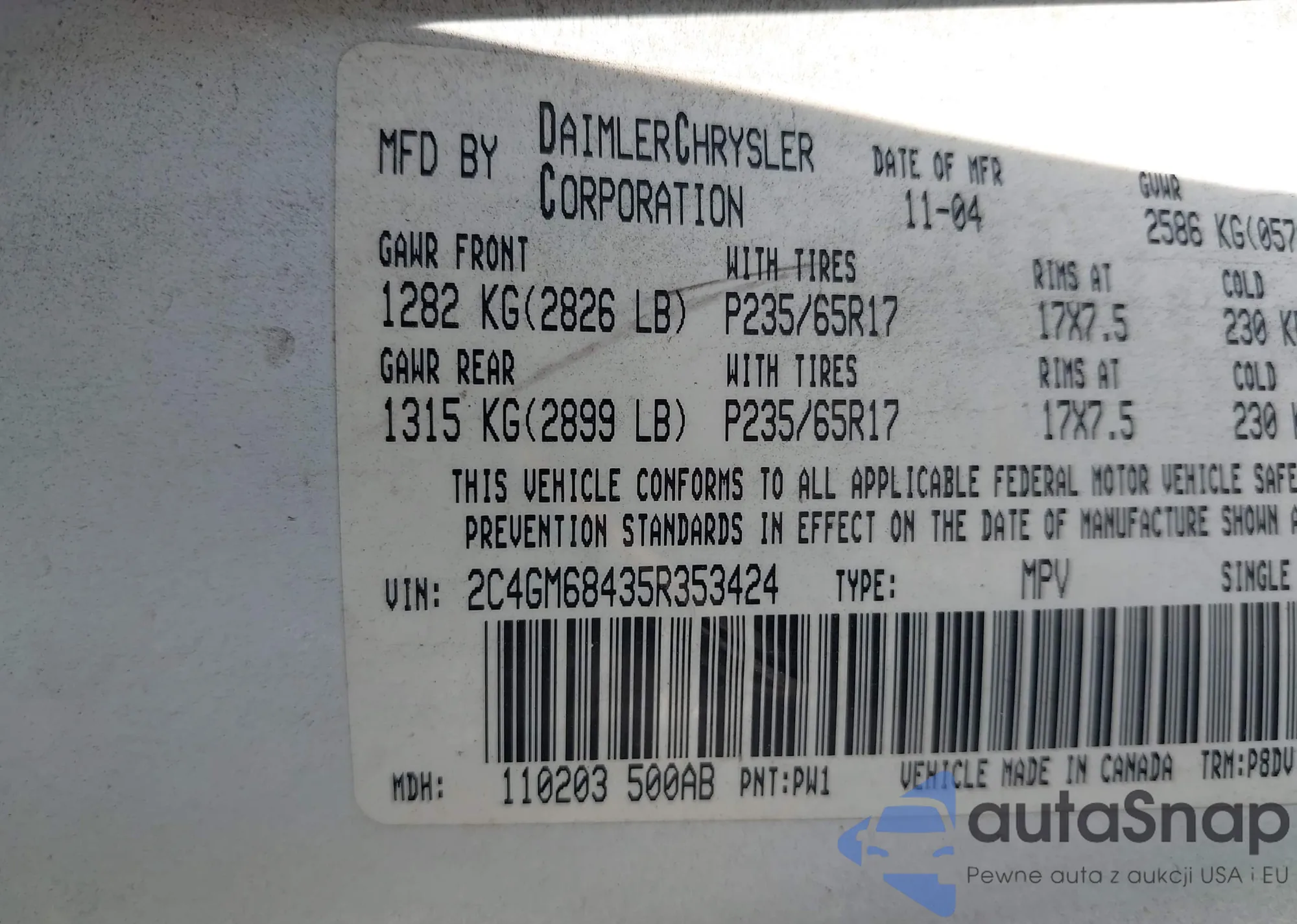 LOT: 42586613 VIN: 2C4GM68435R353424