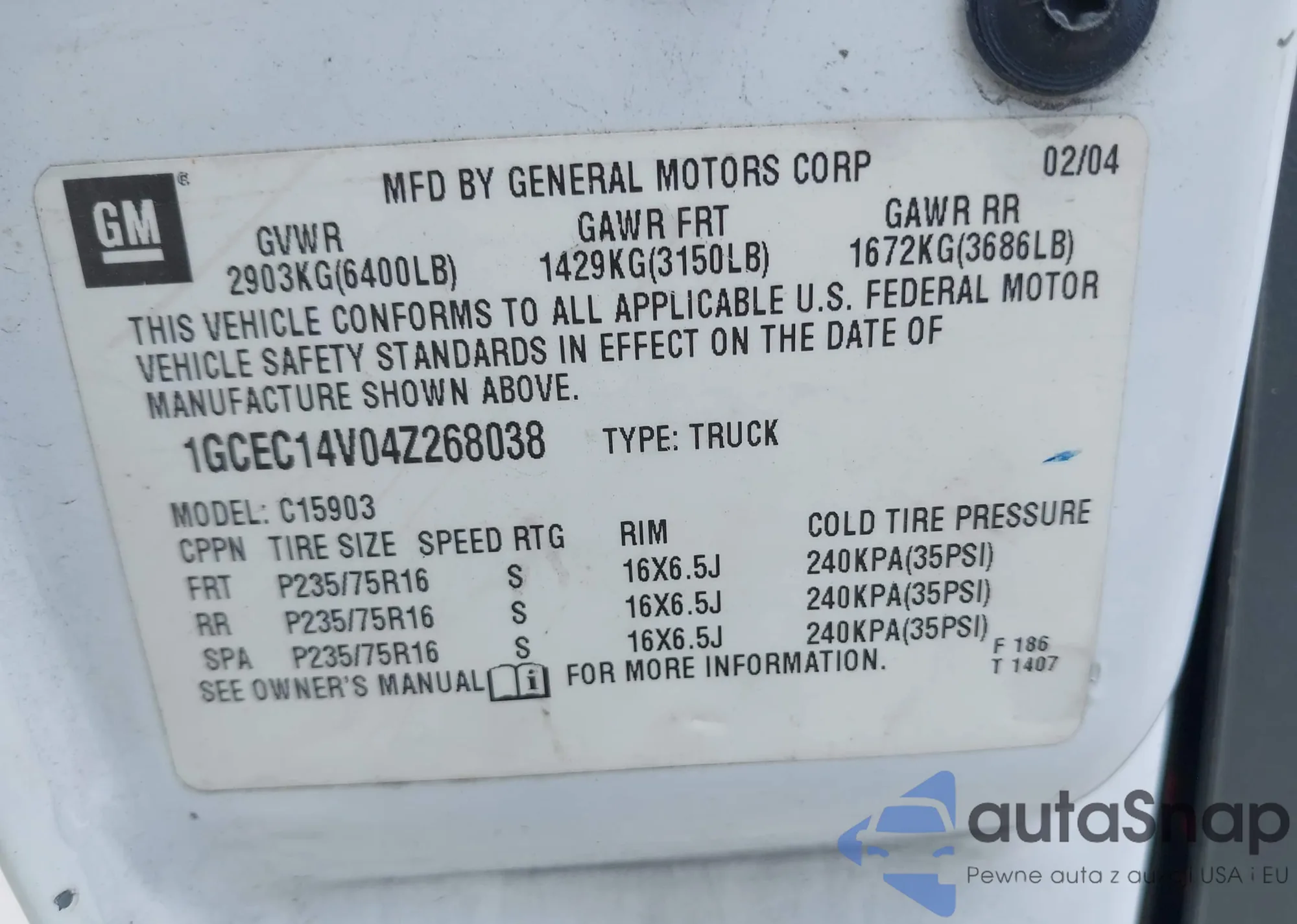 • VIN 1GCEC14V04Z268038
