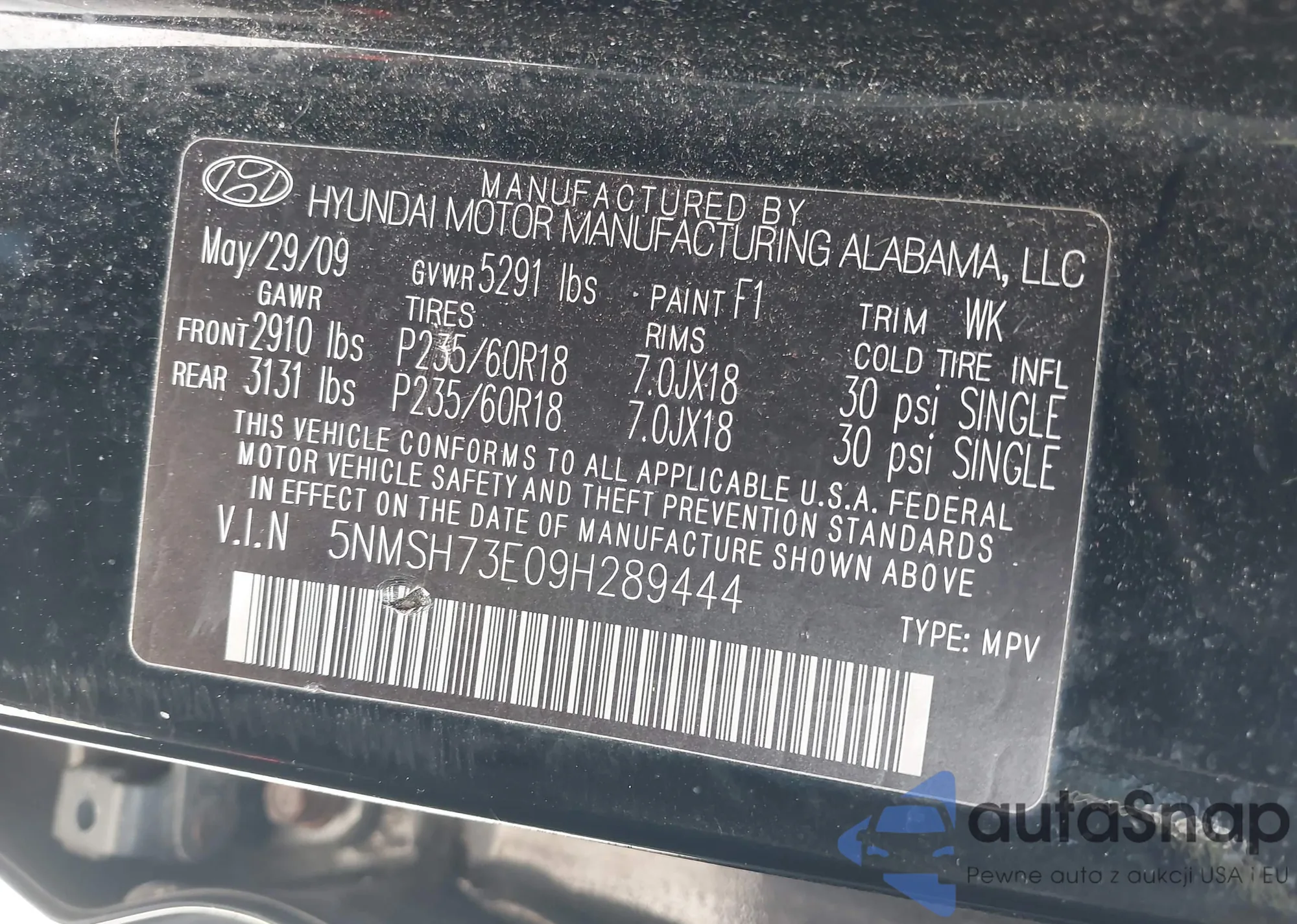 LOT: 42592341 VIN: 5NMSH73E09H289444