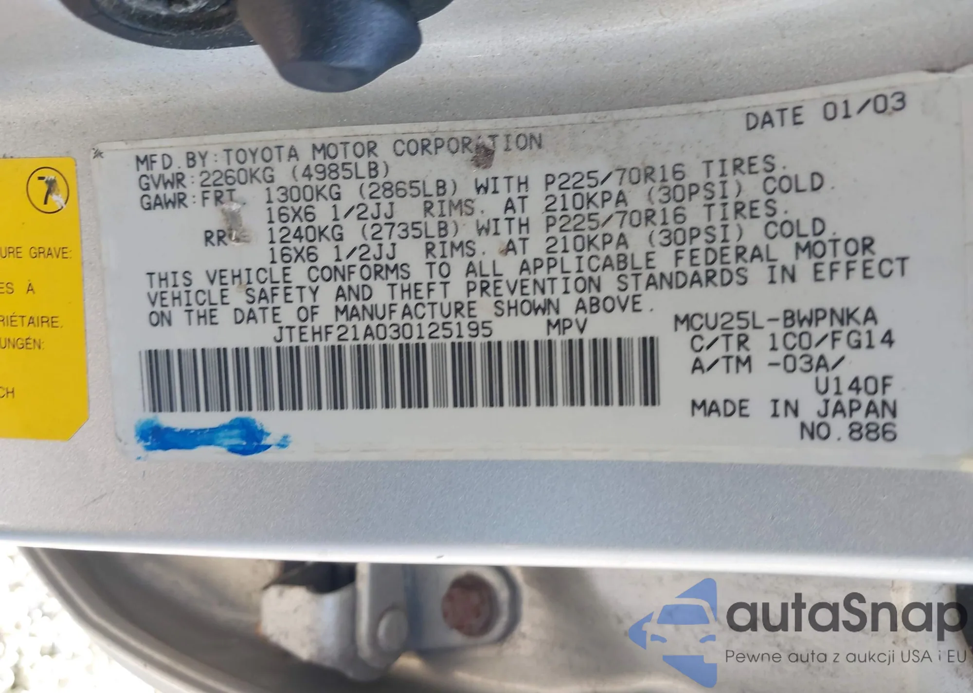 LOT: 42106015 VIN: JTEHF21A030125195