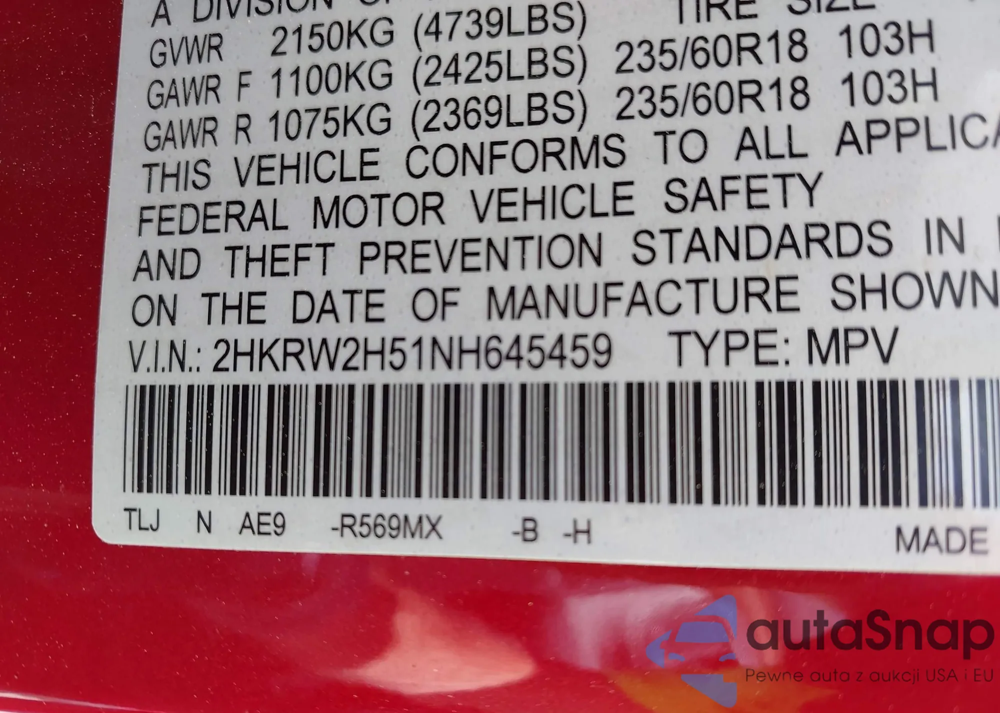 • VIN 2HKRW2H51NH645459