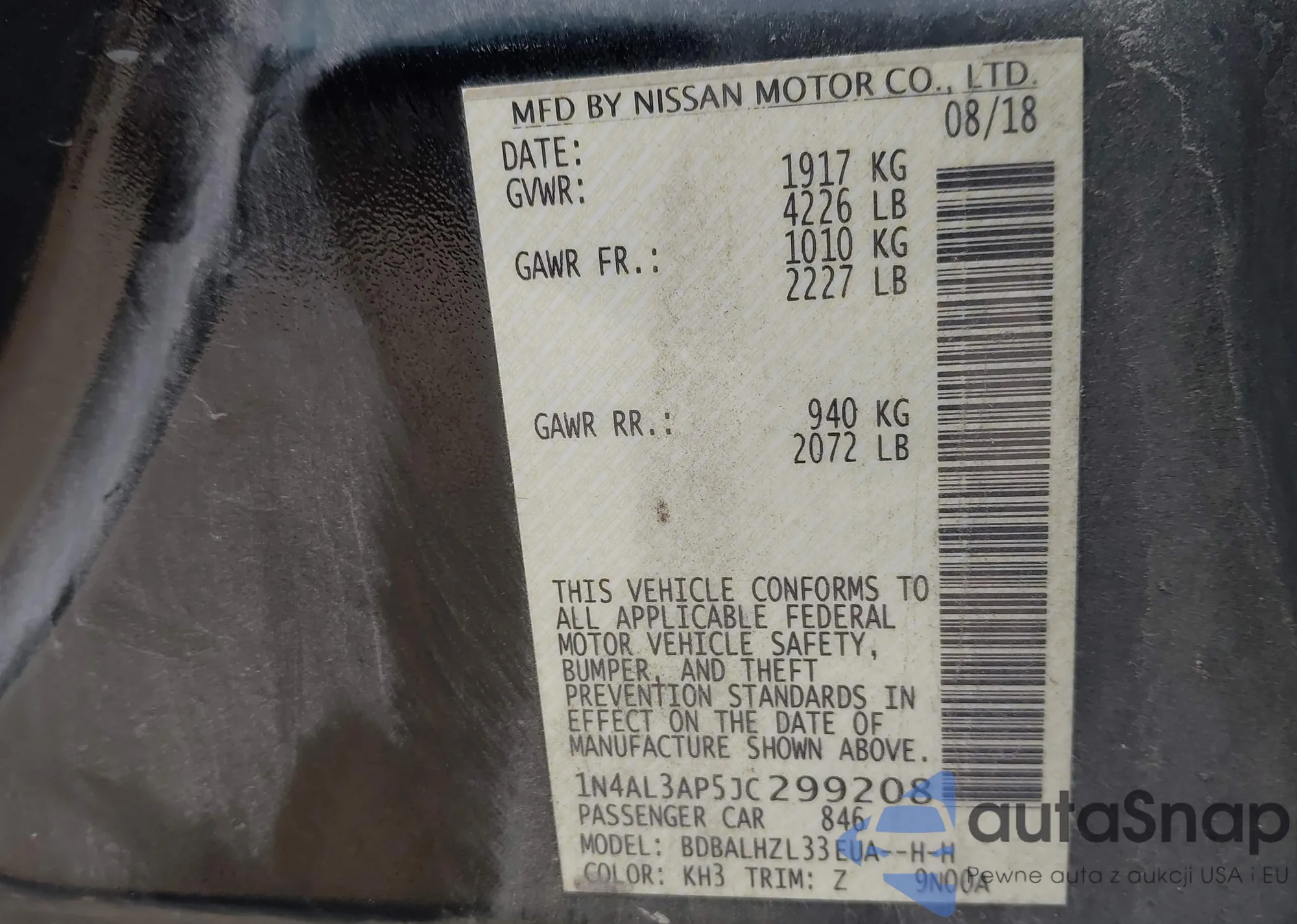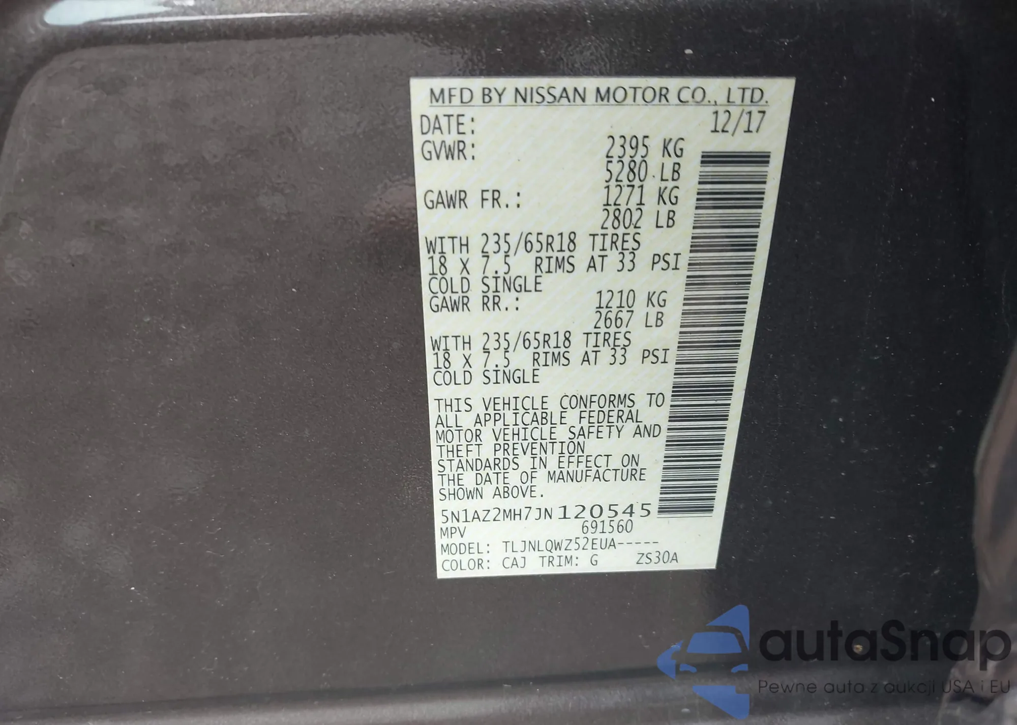 LOT: 42371561 VIN: 5N1AZ2MH7JN120545