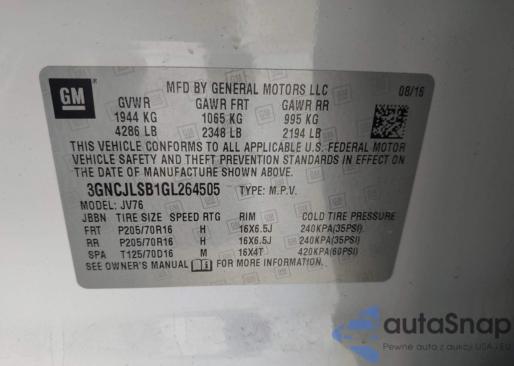 • VIN 3GNCJLSB1GL264505