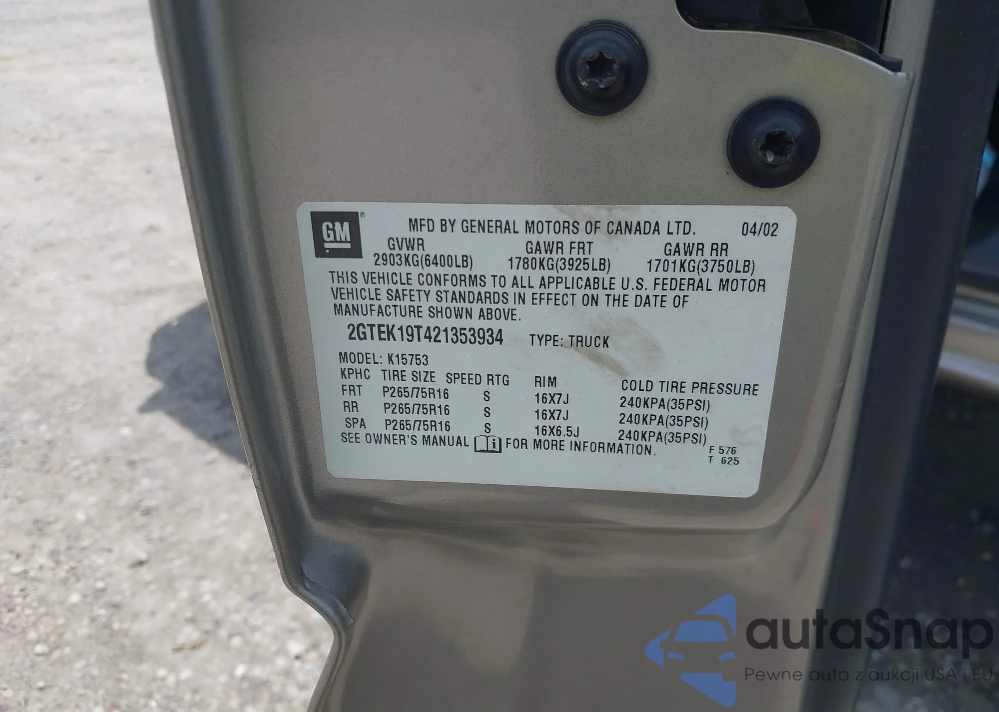 • VIN 2GTEK19T421353934