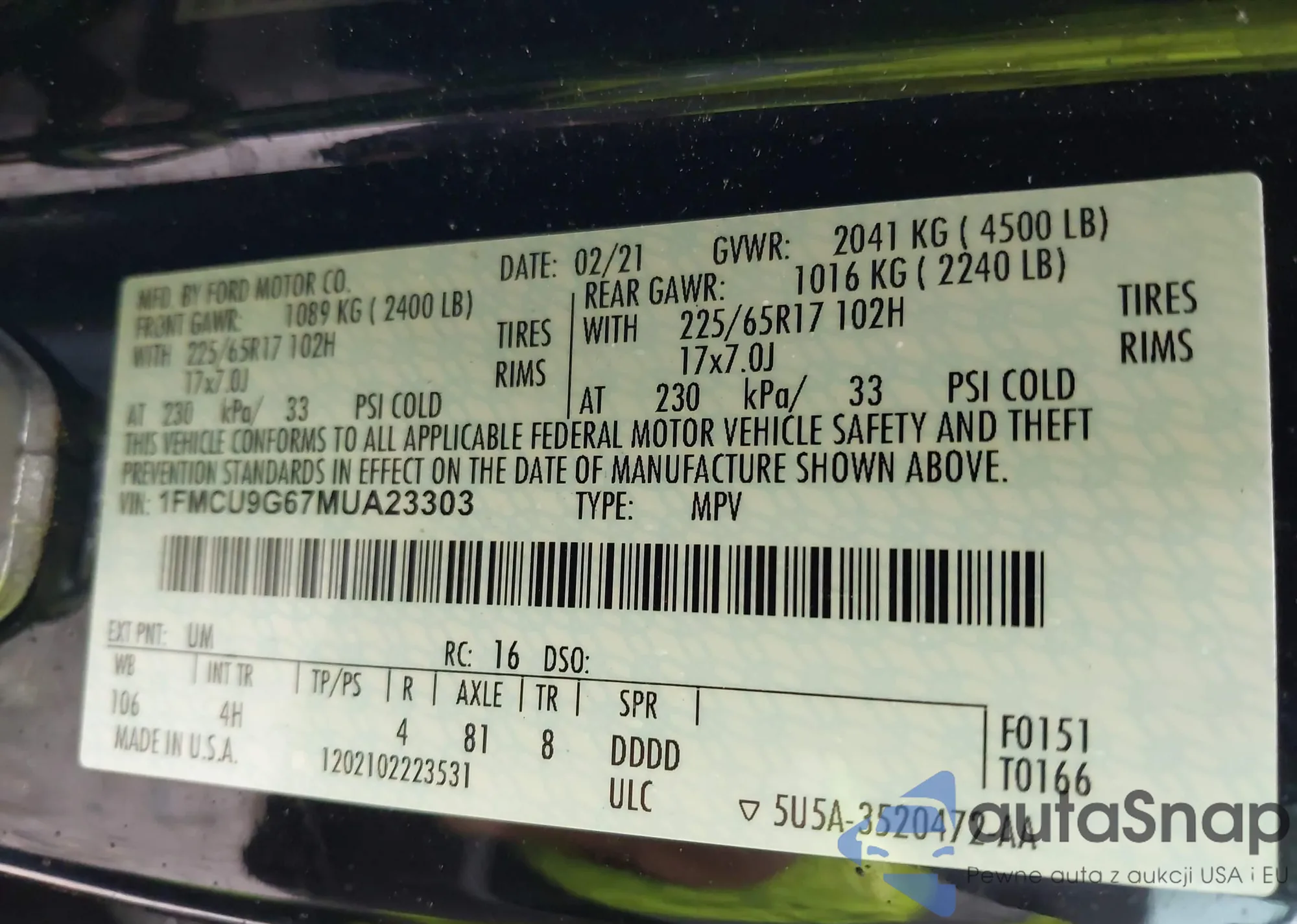 LOT: 42232319 VIN: 1FMCU9G67MUA23303