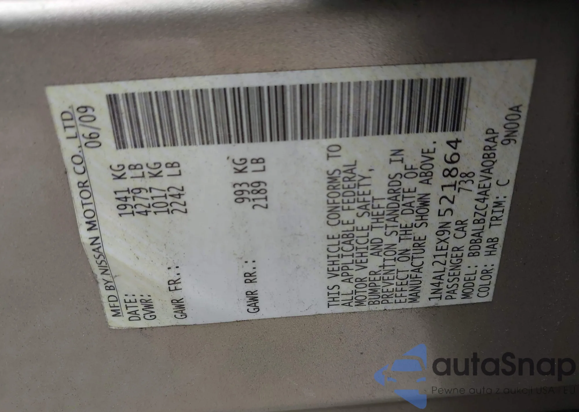 LOT: 42614402 VIN: 1N4AL21EX9N521864