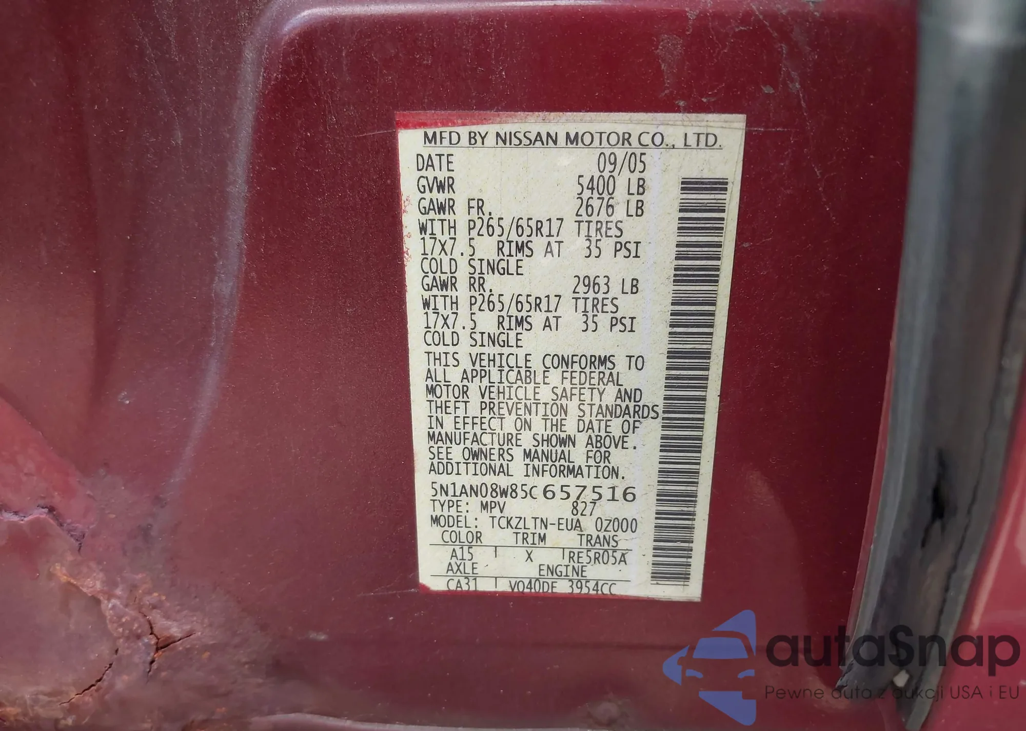 • VIN 5N1AN08W85C657516