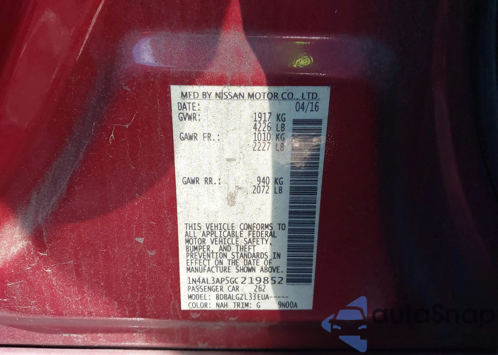 LOT: 40988617 VIN: 1N4AL3AP5GC219852